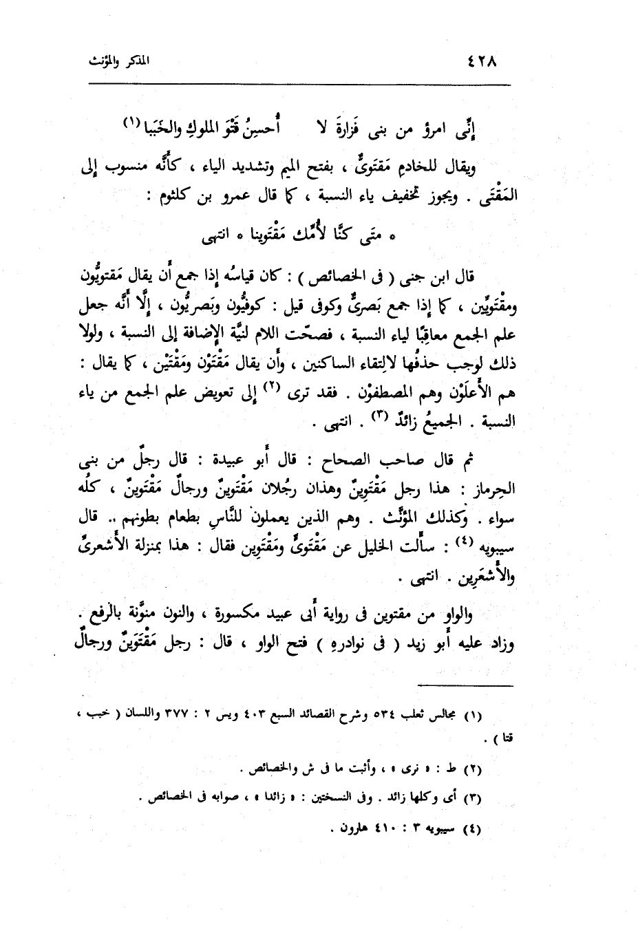 قَالَ ابْن جني فِي الخصائص: كَانَ قِيَاسه إِذا جمع أَن يُقَال: مقتويون ومقتويين كَمَا إِذا جمع بصريٌّ وكوفي قيل: كوفيون وبصريون إِلَّا أَنه جعل علم الْجمع معاقباً لياء النِّسْبَة فَصحت اللَّام لنِيَّة الْإِضَافَة إِلَى النِّسْبَة وَلَوْلَا ذَلِك لوَجَبَ حذفهَا لالتقاء الساكنين وَأَن يُقَال: مقتون ومقتين كَمَا يُقَال: هم الأعلون وهم المصطفون.
