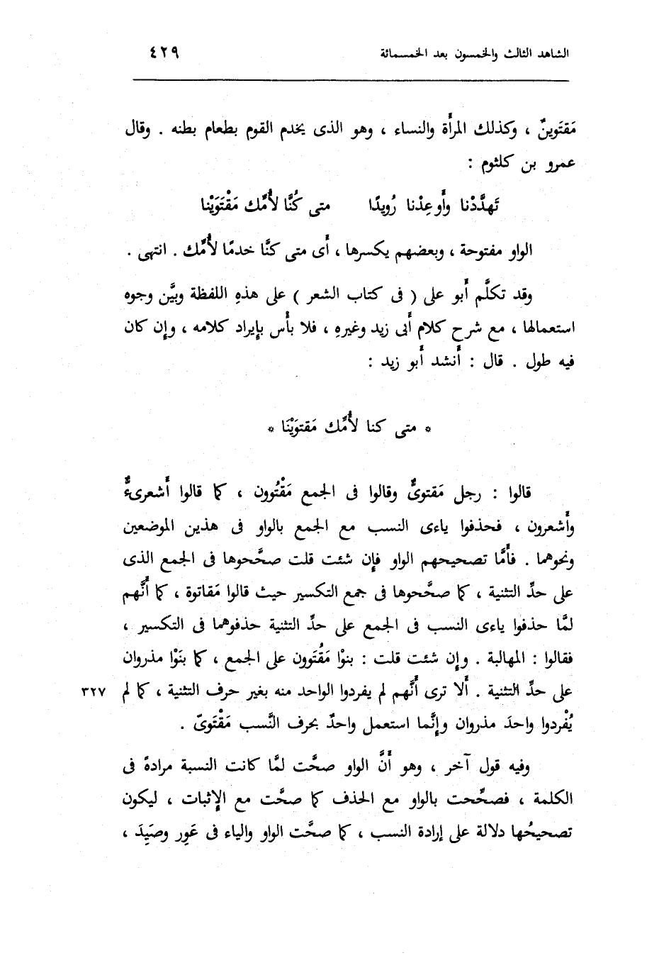 أنْشد أَبُو زيد: مَتى كُنَّا لأمك مقتوينا قَالُوا: رجل مقتويٌّ وَقَالُوا فِي الْجمع مقتوون كَمَا قَالُوا أشعريٌّ وأشعرون فحذفوا ياءي النّسَب فَأَما تصحيحهم الْوَاو فَإِن شِئْت قلت صححوها فِي الْجمع الَّذِي على حد التَّثْنِيَة كَمَا صححوها فِي جمع التكسير حَيْثُ قَالُوا مقاتوة كَمَا أَنهم لما حذفوا ياءي النّسَب فِي الْجمع على حد التَّثْنِيَة حذفوهما فِي التكسير فَقَالُوا: المهالبة.