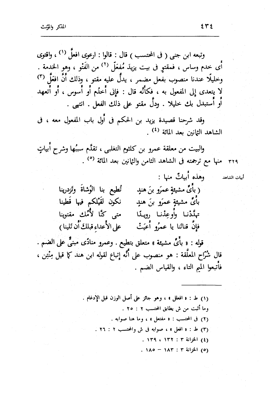 (بِأَيّ مشيئةٍ عَمْرو بن هندٍ ... نَكُون لقيلكم فِيهَا قطينا)