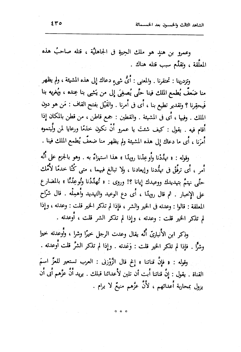 وَعَمْرو بن هندٍ هُوَ ملك الْحيرَة فِي الْجَاهِلِيَّة قَتله صَاحب هَذِه الْمُعَلقَة وَتقدم سَبَب قَتله هُنَاكَ. وتزدرينا: تحتقرنا. وَالْمعْنَى: أَي شيءٍ دعَاك إِلَى هَذِه الْمَشِيئَة وَلم يظْهر منا ضعف يطْمع الْملك فِينَا حَتَّى يصغي إِلَى من يشي بِنَا عِنْده ويغريه بِنَا فيحقرنا وَتَقْدِير تطيع بِنَا أَي: فِي أمرنَا. والقيل بِفَتْح الْقَاف: من هُوَ دون الْملك. وفيهَا أَي: فِي الْمَشِيئَة. والقطين: جمع قاطن من قطن بِالْمَكَانِ إِذا أَقَامَ فِيهِ.)