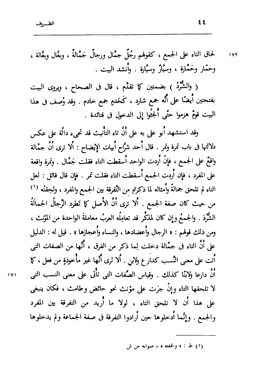 معنى النّسَب الَّتِي لَا تلحقها التَّاء وَإِن جرت على مؤنث نَحْو: حَائِض وطامث فَكَانَ يَنْبَغِي على هَذَا أَن لَا تلْحق التَّاء لَوْلَا مَا أُرِيد من التَّفْرِقَة بَين الْمُفْرد وَالْجمع.
