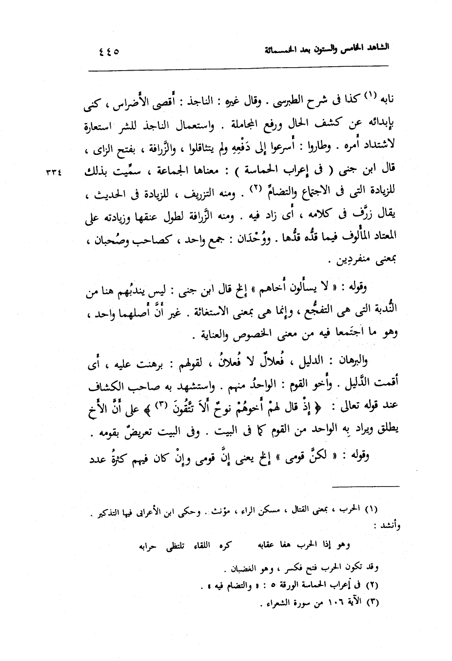 وَقَالَ غَيره: الناجذ: أقْصَى الأضراس كنى بإبدائه عَن كشف الْحَال وَرفع المجاملة. وَاسْتِعْمَال وطاروا: أَسْرعُوا إِلَى دَفعه وَلم يتثاقلوا والزرافة بِفَتْح الزَّاي قَالَ ابْن جني فِي إِعْرَاب الحماسة: مَعْنَاهَا الْجَمَاعَة سميت بذلك للزِّيَادَة الَّتِي فِي الِاجْتِمَاع والتضام. وَمِنْه التزريف)