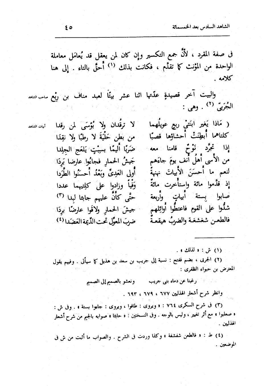 فِي صفة الْمُفْرد لِأَن جمع التكسير وَإِن كَانَ لمن يعقل قد يُعَامل مُعَاملَة الْوَاحِدَة من الْمُؤَنَّث كَمَا تقدم فَكَانَت بذلك أَحَق وَالْبَيْت آخر قصيدةٍ عدتهَا اثْنَا عشر بَيْتا لعبد منَاف بن ربع الجربي. وَهِي: الْبَسِيط