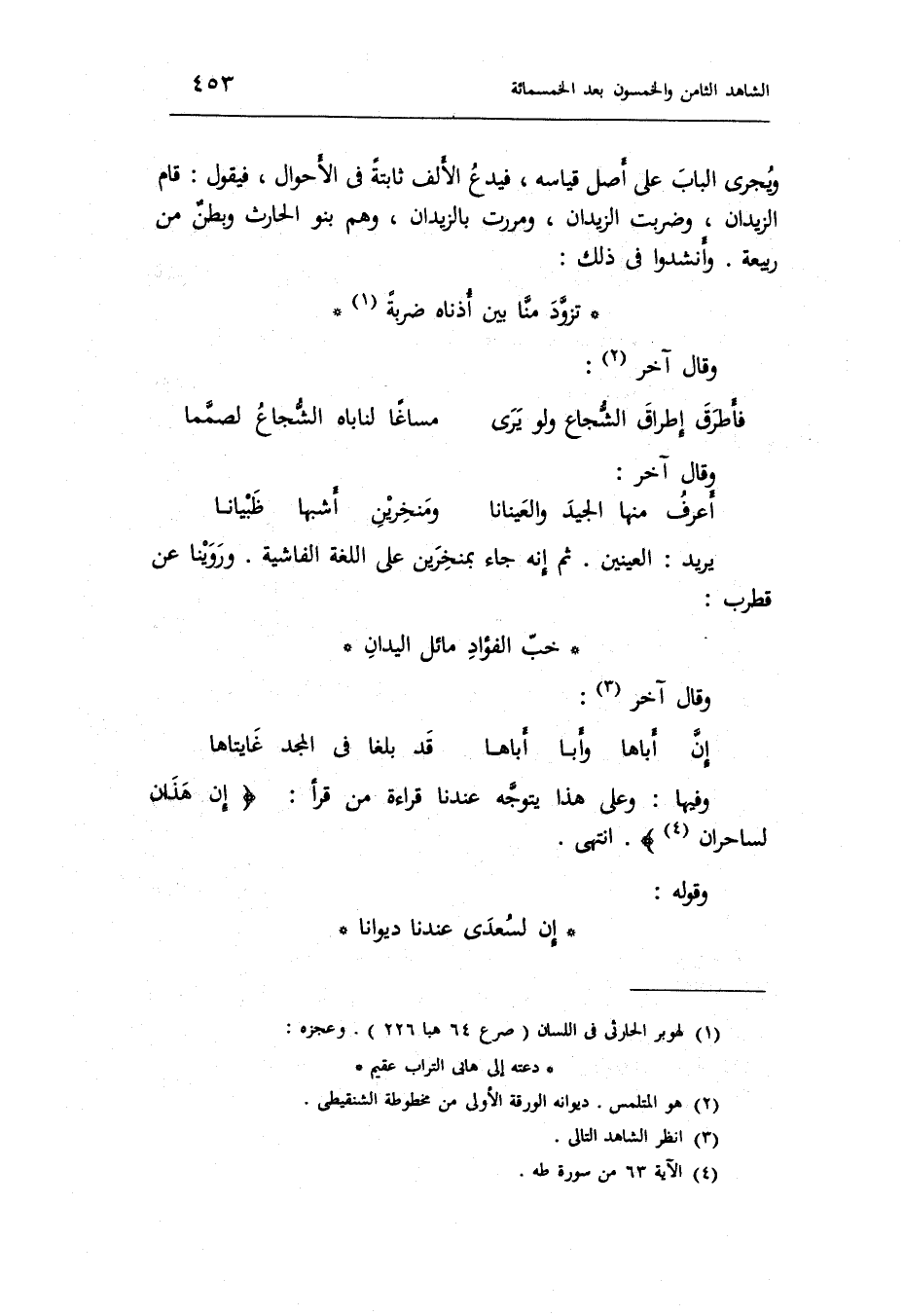 وَيجْرِي الْبَاب على أصل قِيَاسه فيدع الْألف ثَابِتَة فِي الْأَحْوَال فَيَقُول: قَامَ الزيدان وَضربت الزيدان ومررت بالزيدان وهم بَنو الْحَارِث وبطنٌ من ربيعَة.
