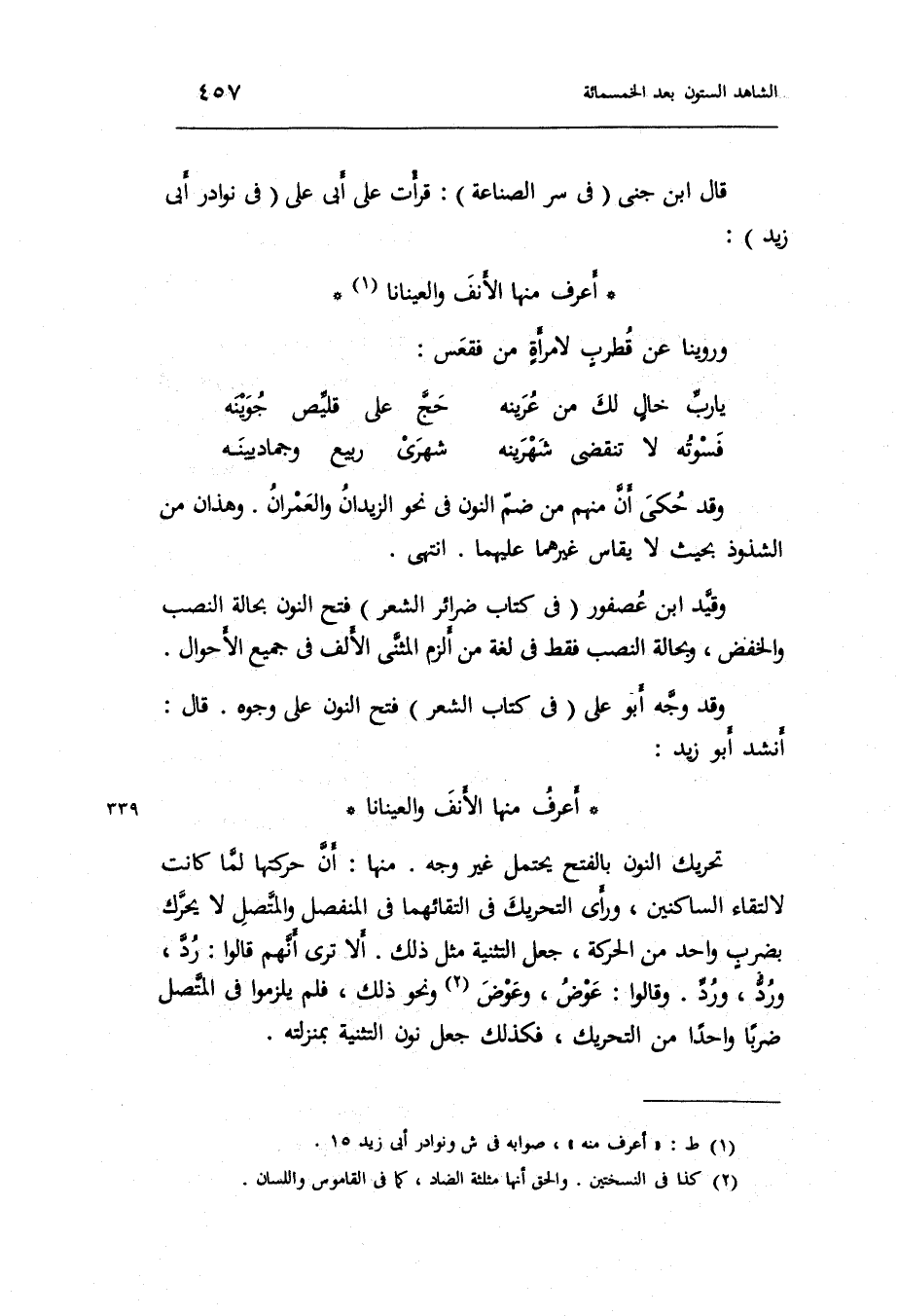وَقد وَجه أَبُو عَليّ فِي كتاب الشّعْر فتح النُّون على وُجُوه. قَالَ: أنْشد أَبُو زيد: أعرف مِنْهَا الْأنف والعينانا تَحْرِيك النُّون بِالْفَتْح يحْتَمل غير وَجه. مِنْهَا: أَن حركتها لما كَانَت لالتقاء الساكنين وَرَأى التحريك فِي التقائهما فِي الْمُنْفَصِل والمتصل لَا يُحَرك بضربٍ وَاحِد من الْحَرَكَة جعل التَّثْنِيَة مثل ذَلِك.