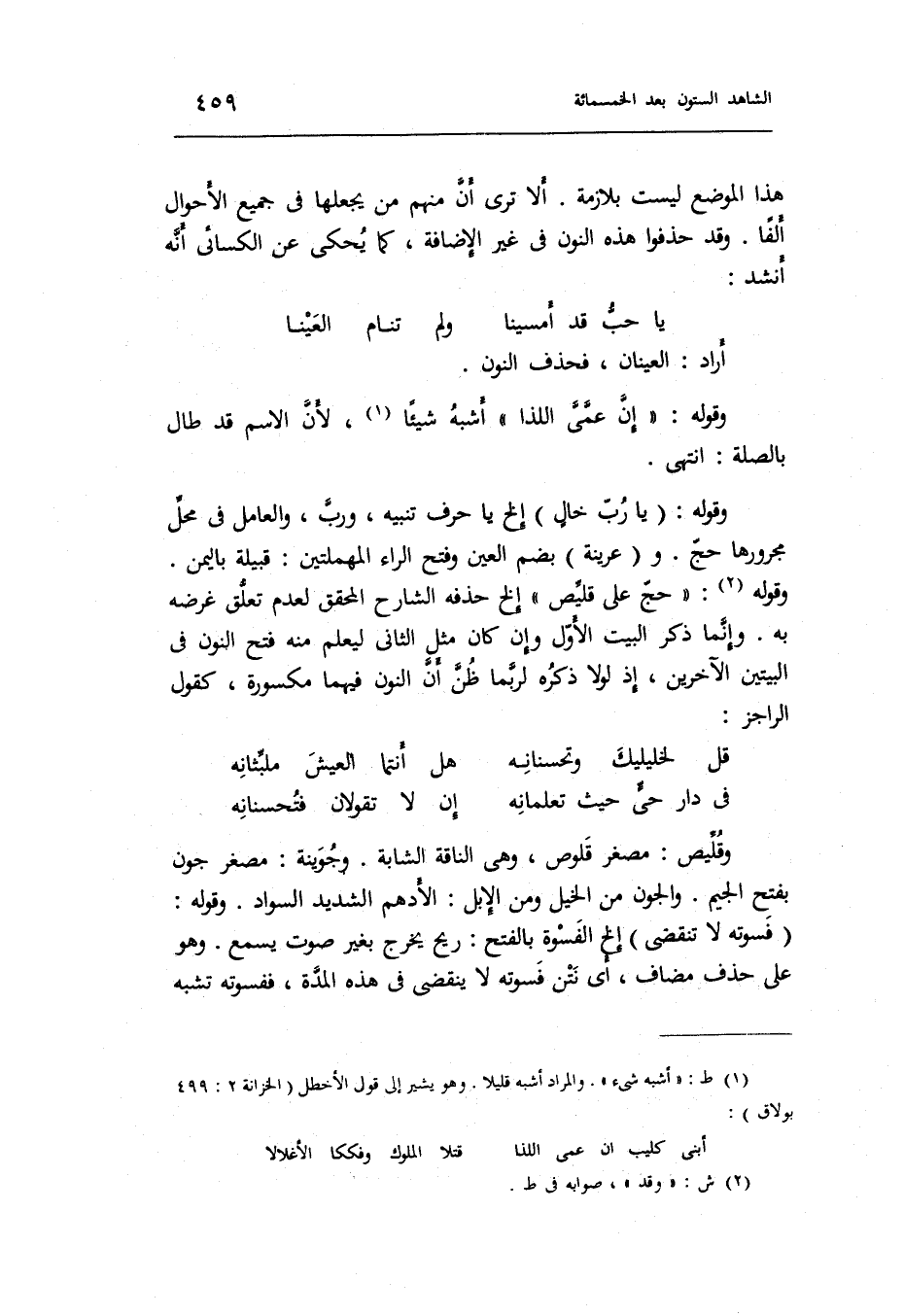 وَقَوله: حج على قليص إِلَخ حذفه الشَّارِح الْمُحَقق لعدم تعلق غَرَضه بِهِ. وَإِنَّمَا ذكر الْبَيْت الأول وَإِن كَانَ مثل الثَّانِي ليعلم مِنْهُ فتح النُّون فِي الْبَيْتَيْنِ الآخرين إِذْ لَوْلَا ذكره لربما ظن أَن النُّون فيهمَا مَكْسُورَة كَقَوْل الراجز: الرجز