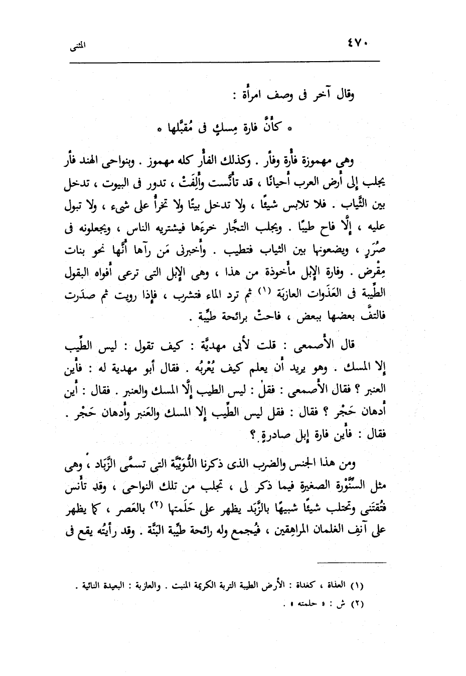 قَالَ الْأَصْمَعِي: قلت لأبي مهدية: كَيفَ تَقول: لَيْسَ الطّيب إِلَّا الْمسك. وَهُوَ يُرِيد أَن يعلم كَيفَ يعربه. فَقَالَ أَبُو مهدية لَهُ: فَأَيْنَ العنبر فَقَالَ الْأَصْمَعِي: فَقل: لَيْسَ الطّيب إِلَّا الْمسك والعنبر. فَقَالَ: أَيْن أدهان حجر فَقَالَ: فَقل لَيْسَ الطّيب إِلَّا الْمسك والعنبر وأدهان حجر. فَقَالَ: فَأَيْنَ فارة إبل صادرةٍ وَمن هَذَا الْجِنْس وَالضَّرْب الَّذِي ذكرنَا الدويبة الَّتِي تسمى الزباد وَهِي مثل السنورة الصَّغِيرَة فِيمَا ذكر لي تجلب من تِلْكَ النواحي وَقد تأنس فتقتنى وتحتلب شَيْئا شَبِيها بالزبد يظْهر على حلمتها بالعصر كَمَا يظْهر على آنف الغلمان المراهقين فَيجمع وَله رَائِحَة طيبَة البنة. وَقد رَأَيْته)