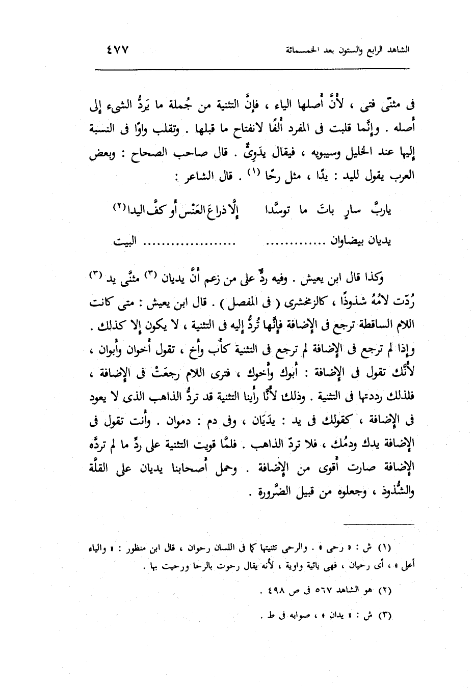 يديان بيضاوان ... ... ... ... ... ... . . الْبَيْت وَكَذَا قَالَ ابْن يعِيش. وَفِيه ردٌّ على من زعم أَن يديان مثنى يَد ردَّتْ لامه شذوذاً كالزمخشري فِي الْمفصل.