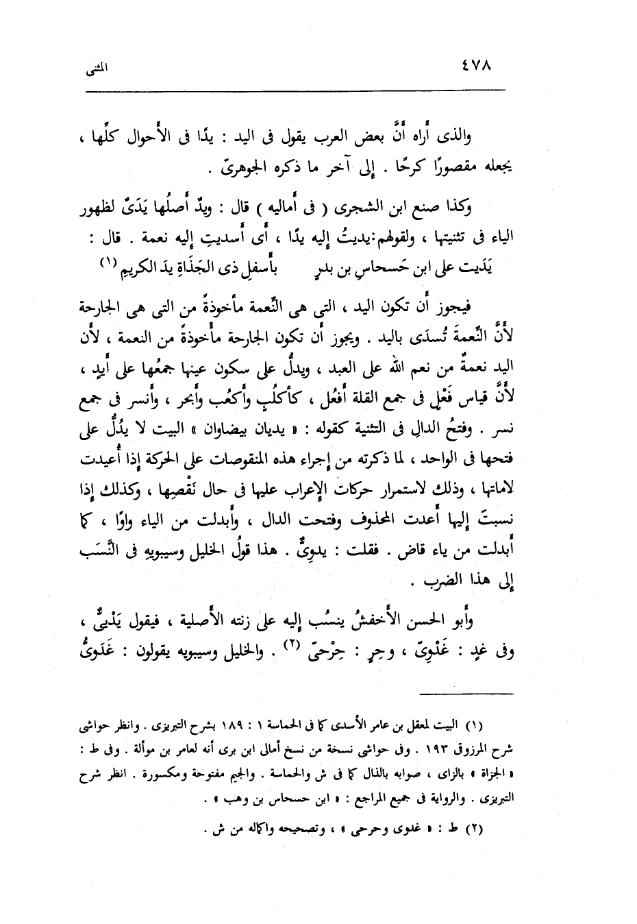وَكَذَا صنع ابْن الشجري فِي أَمَالِيهِ قَالَ: ويدٌ أَصْلهَا يديٌ لظُهُور الْيَاء فِي تثنيتها ولقولهم:)