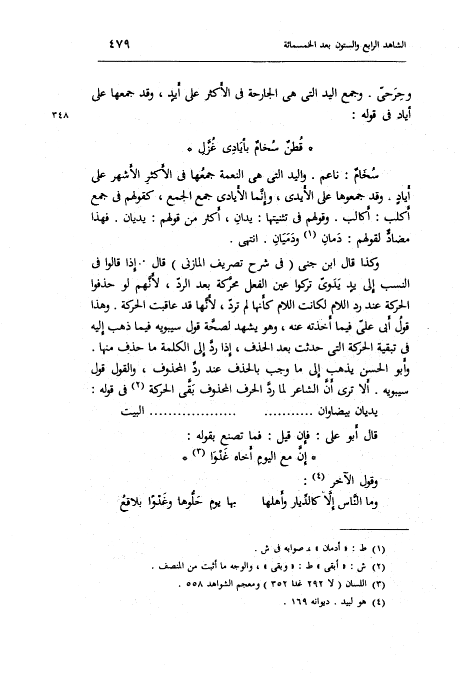 أَلا ترى أَن الشَّاعِر لما رد الْحَرْف الْمَحْذُوف بقى الْحَرَكَة فِي قَوْله: يديان بيضاوان ... ... ... ... ... ... ... . . الْبَيْت قَالَ أَبُو عَليّ: فَإِن قيل: فَمَا تصنع بقوله: الرجز إِن مَعَ الْيَوْم أَخَاهُ غدوا وَقَول الآخر: الطَّوِيل