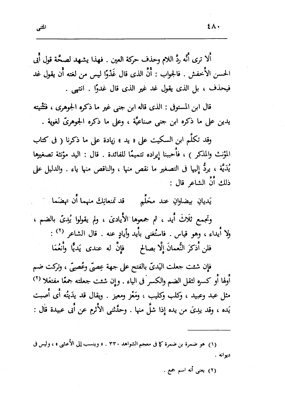 قَالَ ابْن المستوفي: الَّذِي قَالَه ابْن جني غير مَا ذكره الْجَوْهَرِي فتثنيته يدين على مَا ذكره ابْن جني صناعية وعَلى مَا ذكره الْجَوْهَرِي لغوية.
