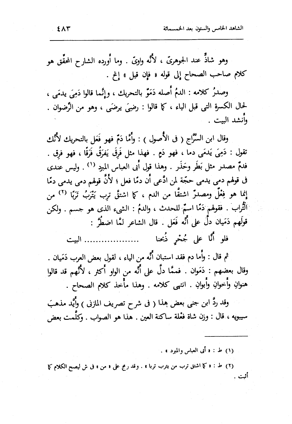قَالَ الشَّاعِر لما اضْطر: فَلَو أَنا على جحرٍ ذبحنا ... ... ... ... . . الْبَيْت ثمَّ قَالَ: وَأما دم فقد استبان أَنه من الْيَاء لقَوْل بعض الْعَرَب دميان. وَقَالَ بَعضهم: دموان.