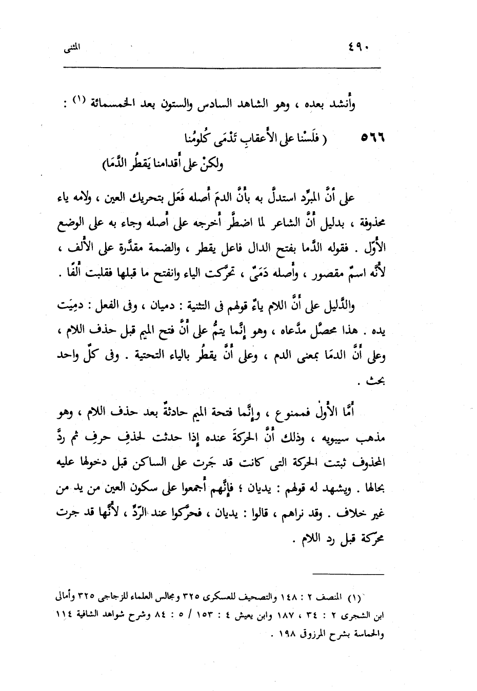 على أَن الْمبرد اسْتدلَّ بِهِ بِأَن الدَّم أَصله فعل بتحريك الْعين ولامه يَاء محذوفة بِدَلِيل أَن الشَّاعِر لما اضْطر أخرجه على أَصله وَجَاء بِهِ على الْوَضع الأول. فَقَوله الدما بِفَتْح الدَّال فَاعل يقطر والضمة مقدرَة على الْألف لِأَنَّهُ اسمٌ مَقْصُور وَأَصله دميٌ تحركت الْيَاء وَانْفَتح مَا قبلهَا فقلبت ألفا.