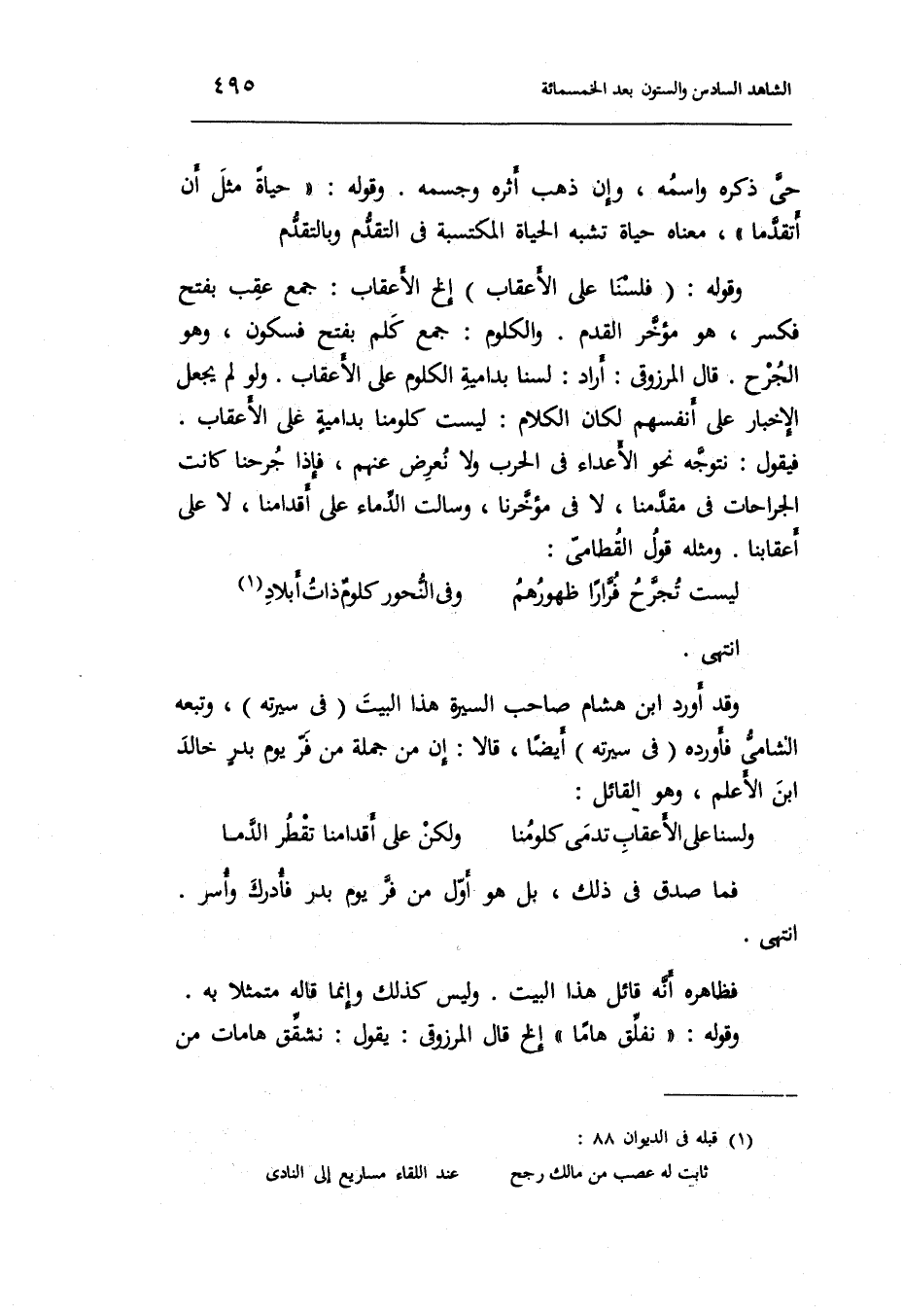 قَالَ المرزوقي: أَرَادَ: لسنا بدامية الكلوم على الأعقاب. وَلَو لم يَجْعَل الْإِخْبَار على أنفسهم لَكَانَ الْكَلَام: لَيست كلومنا بداميةٍ على الأعقاب. فَيَقُول: نتوجه نَحْو الْأَعْدَاء فِي الْحَرْب وَلَا نعرض عَنْهُم فَإِذا جرحنا كَانَت الْجِرَاحَات فِي مقدمنا لَا فِي مؤخرنا وسالت الدِّمَاء على أقدامنا لَا على أعقابنا.