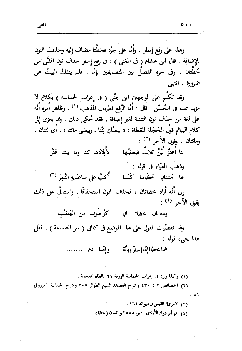 وَقد تكلم على الْوَجْهَيْنِ ابْن جني فِي إِعْرَاب الحماسة بكلامٍ لَا مزِيد عَلَيْهِ فِي الْحسن. قَالَ: أما الرّفْع فظريف الْمَذْهَب وَظَاهر أمره أَنه على لُغَة من حذف نون التَّثْنِيَة لغير إِضَافَة فقد حُكيَ ذَلِك.
