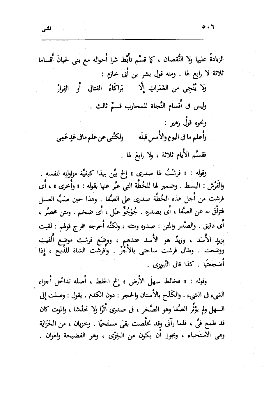 وَمتْن مخصر أَي: دَقِيق. والصدر والمتن: صَدره وَمَتنه وَلكنه أخرجه مخرج قَوْلهم: لقِيت بزيدٍ الْأسد وزيدٌ هُوَ الْأسد عِنْدهم وَوضع فرشت مَوضِع ألقيت وَوضعت. وَيُقَال: فرشت ساحتي بِالْأَجْرِ. وأفرشت الشَّاة للذبح إِذا أضجعتها. كَذَا قَالَ التبريزي.