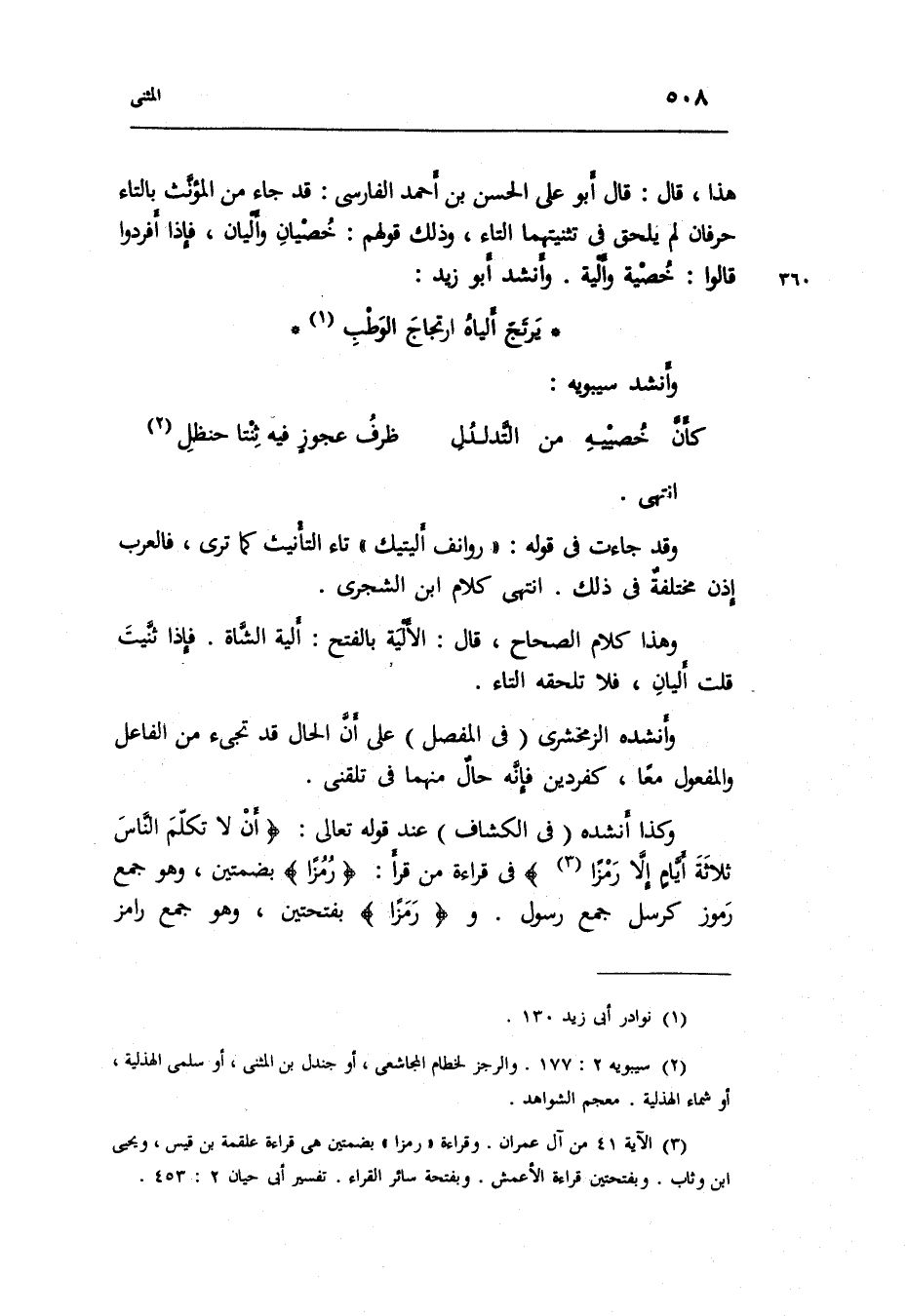وَقد جَاءَت فِي قَوْله: روانف أليتيك تَاء التَّأْنِيث كَمَا ترى فالعرب إِذن مختلفةٌ فِي ذَلِك. انْتهى كَلَام ابْن الشجري.