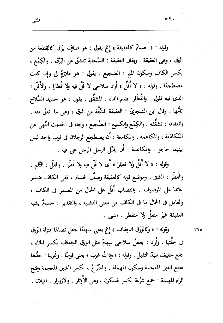 وَقَوله: لَا أفل وَلَا فطَارَا أَي: لَا فل فِيهِ وَلَا فطر. والفل: الثلم. وَالْفطر: الشق. وَمَوْضِع قَوْله: كالعقيقة وصفٌ لحسام فَفِي الْكَاف ضمير عَائِد على الْمَوْصُوف. وانتصاب أفل على الْحَال من الْمُضمر فِي الْكَاف وَالْعَامِل فِي الْحَال مَا فِي الْكَاف من معنى التَّشْبِيه وَالتَّقْدِير: حسامٌ يشبه الْعَقِيقَة غير منفل وَلَا منفطر. انْتهى.