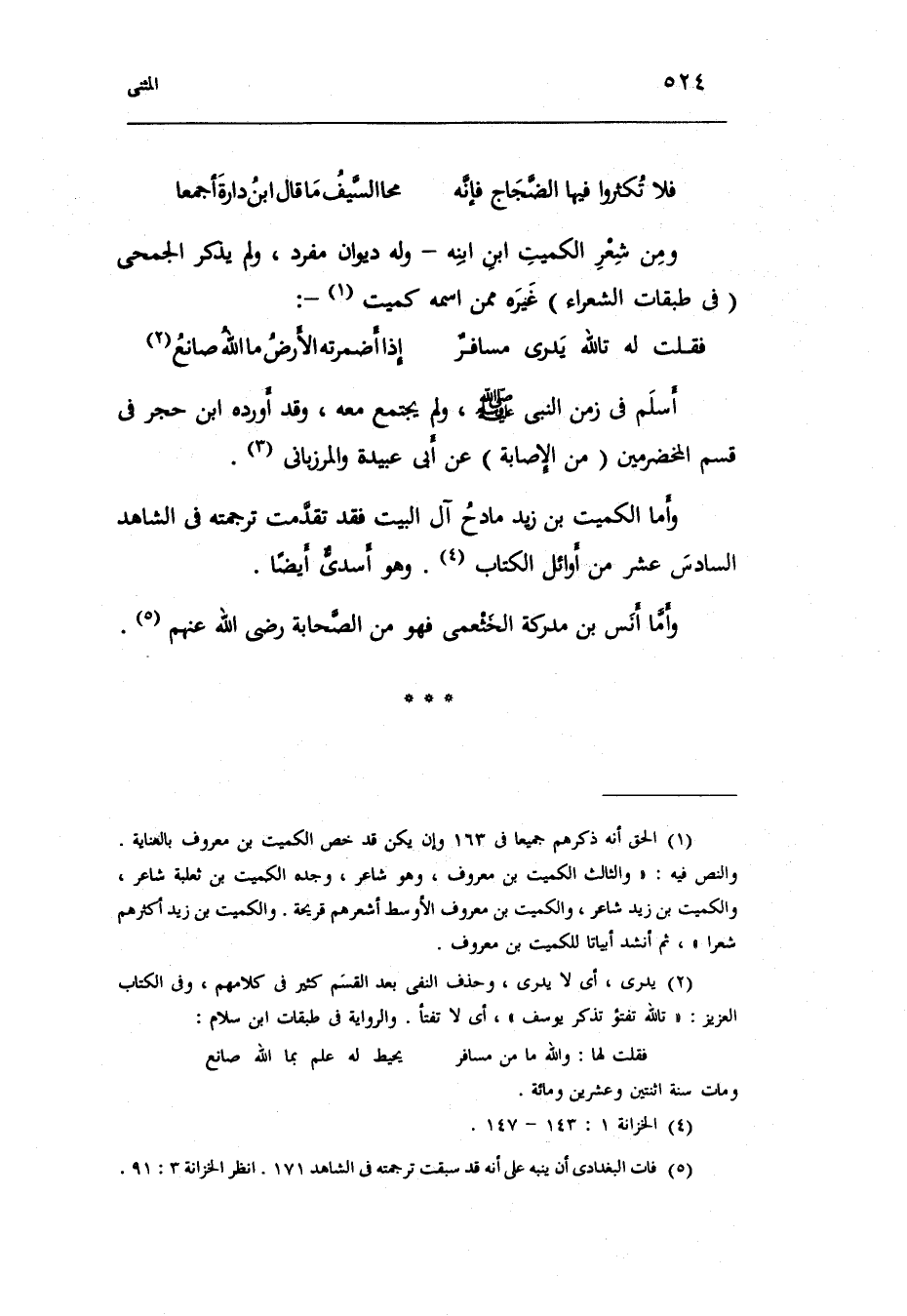 وَأما الْكُمَيْت بن زيد مادح آل الْبَيْت فقد تقدّمت تَرْجَمته فِي الشَّاهِد السَّادِس عشر من أَوَائِل وَأما أنس بن مدركة الْخَثْعَمِي فَهُوَ من الصَّحَابَة رَضِيَ اللَّهُ عَنْهم.