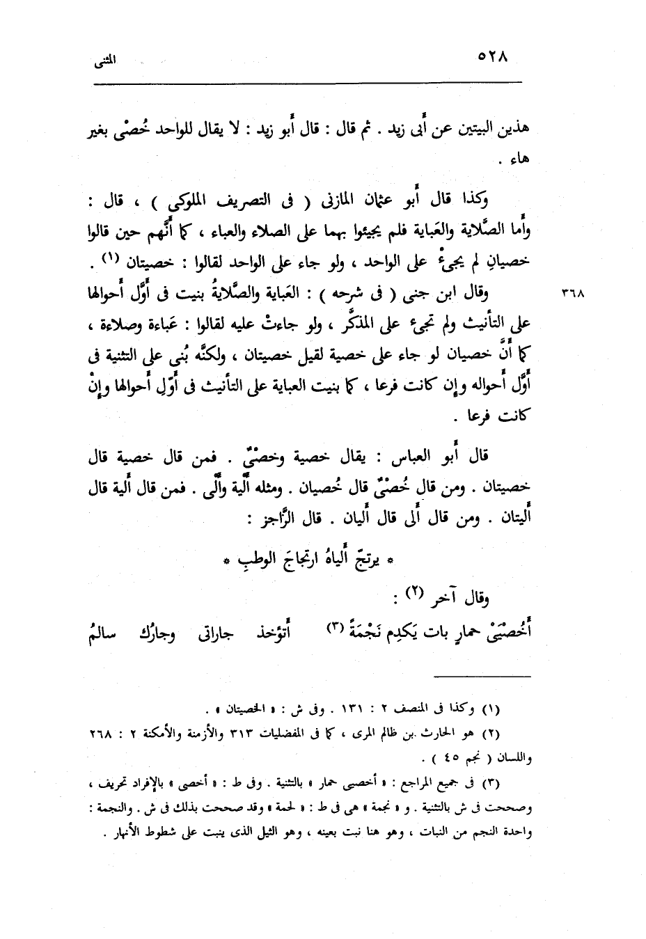وَكَذَا قَالَ أَبُو عُثْمَان الْمَازِني فِي تصريف الملوكي قَالَ: وَأما الصلابة والعباية فَلم يجيئوا بهما على الصلاء والعباء كَمَا أَنهم حِين قَالُوا: خصيان لم يجِئ على الْوَاحِد وَلَو جَاءَ على الْوَاحِد)