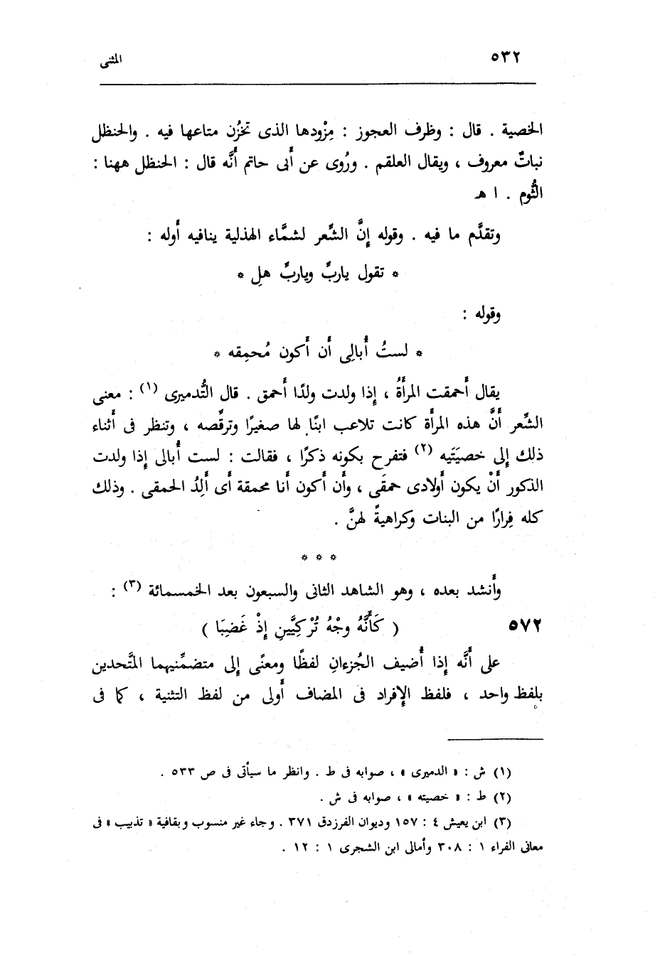 وَتقدم مَا فِيهِ. وَقَوله إِن الشّعْر لشماء الهذلية يُنَافِيهِ أَوله: وَقَوله: لست أُبَالِي أَن أكون محمقه يُقَال: أحمقت الْمَرْأَة إِذا ولدت ولدا أَحمَق.