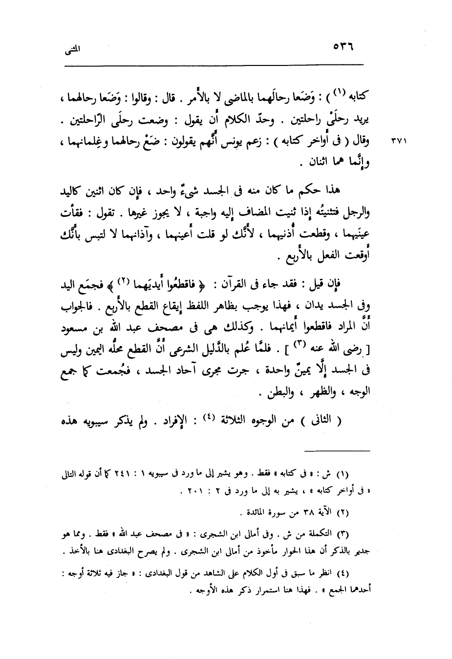 فَإِن قيل: فقد جَاءَ فِي الْقُرْآن: فَاقْطَعُوا أَيْدِيهِمَا فَجمع الْيَد وَفِي الْجَسَد يدان فَهَذَا يُوجب بِظَاهِر اللَّفْظ إِيقَاع الْقطع بالأربع. فَالْجَوَاب أَن المُرَاد فَاقْطَعُوا أيمانهما. وَكَذَلِكَ هِيَ فِي مصحف عبد الله بن مَسْعُود رَضِيَ اللَّهُ عَنْه.
