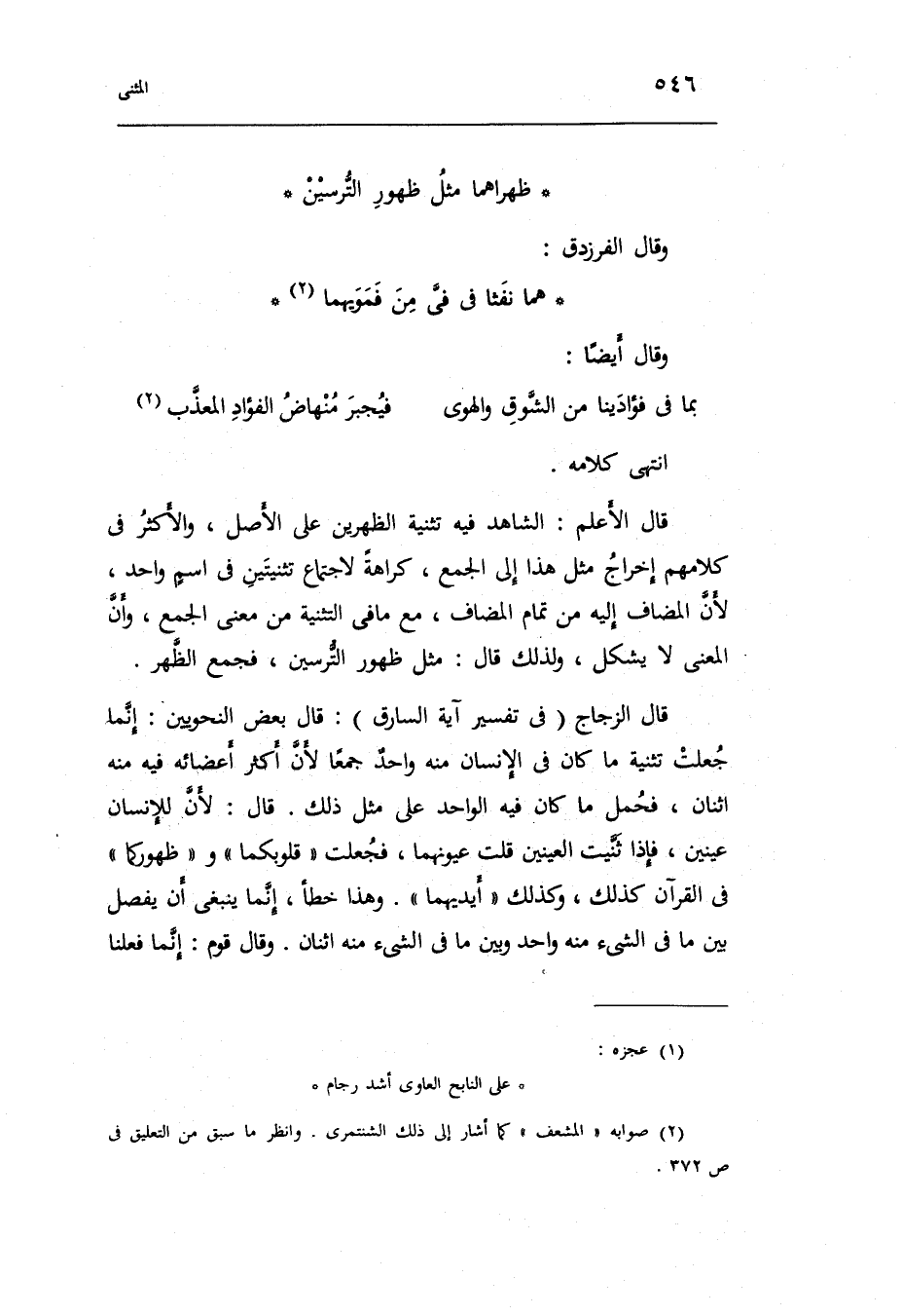 قَالَ الأعلم: الشَّاهِد فِيهِ تَثْنِيَة الظهرين على الأَصْل وَالْأَكْثَر فِي كَلَامهم إِخْرَاج مثل هَذَا إِلَى الْجمع كَرَاهَة لِاجْتِمَاع تثنيتين فِي اسمٍ وَاحِد لِأَن الْمُضَاف إِلَيْهِ من تَمام الْمُضَاف مَعَ مَا فِي التَّثْنِيَة قَالَ الزّجاج فِي تَفْسِير آيَة السَّارِق: قَالَ بعض النَّحْوِيين: إِنَّمَا جعلت تَثْنِيَة مَا كَانَ فِي الْإِنْسَان مِنْهُ واحدٌ جمعا لِأَن أَكثر أَعْضَائِهِ فِيهِ مِنْهُ اثْنَان فَحمل مَا كَانَ فِيهِ الْوَاحِد على مثل ذَلِك.