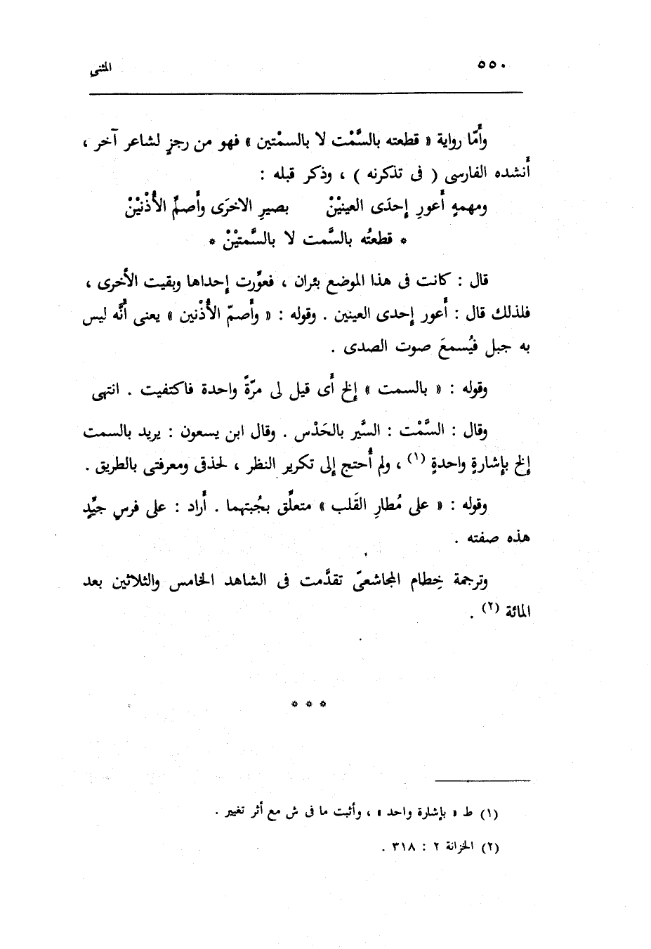 وَأما رِوَايَة: قطعته بالسمت لَا بالسمتين فَهُوَ من رجزٍ لشاعر آخر أنْشدهُ الْفَارِسِي فِي تَذكرته وَذكر قبله: الرجز قطعته بالسمت لَا بالسمتين قَالَ: كَانَت فِي هَذَا الْموضع بئران فعورت إِحْدَاهَا وَبقيت الْأُخْرَى فَلذَلِك قَالَ: أَعور إِحْدَى الْعَينَيْنِ.
