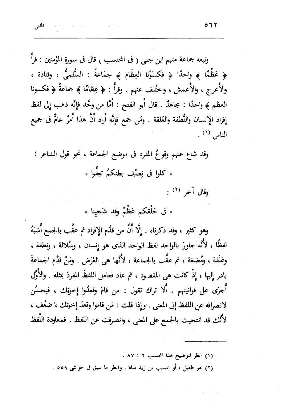 كلوا فِي نصف بطنكم تعفوا وَقَالَ آخر: فِي حلقكم عظمٌ وَقد شجينا وَهُوَ كثير وَقد ذَكرْنَاهُ. إِلَّا أَن من قدم الْإِفْرَاد ثمَّ عقب بِالْجمعِ أشبه لفظا لِأَنَّهُ جاور بِالْوَاحِدِ لفظ الْوَاحِد الَّذِي هُوَ إِنْسَان وسلالة ونطفة وعلقة ومضغة ثمَّ عقب بِالْجَمَاعَة لِأَنَّهَا هِيَ)