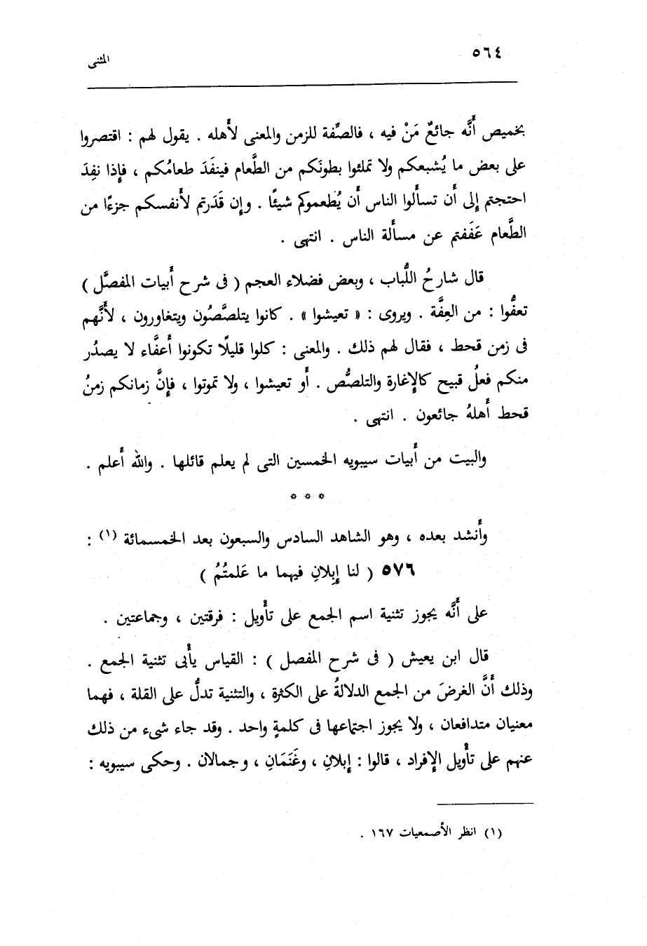 الطَّوِيل لنا إبلان فيهمَا مَا علمْتُم على أَنه يجوز تَثْنِيَة اسْم الْجمع على تَأْوِيل: فرْقَتَيْن وجماعتين.