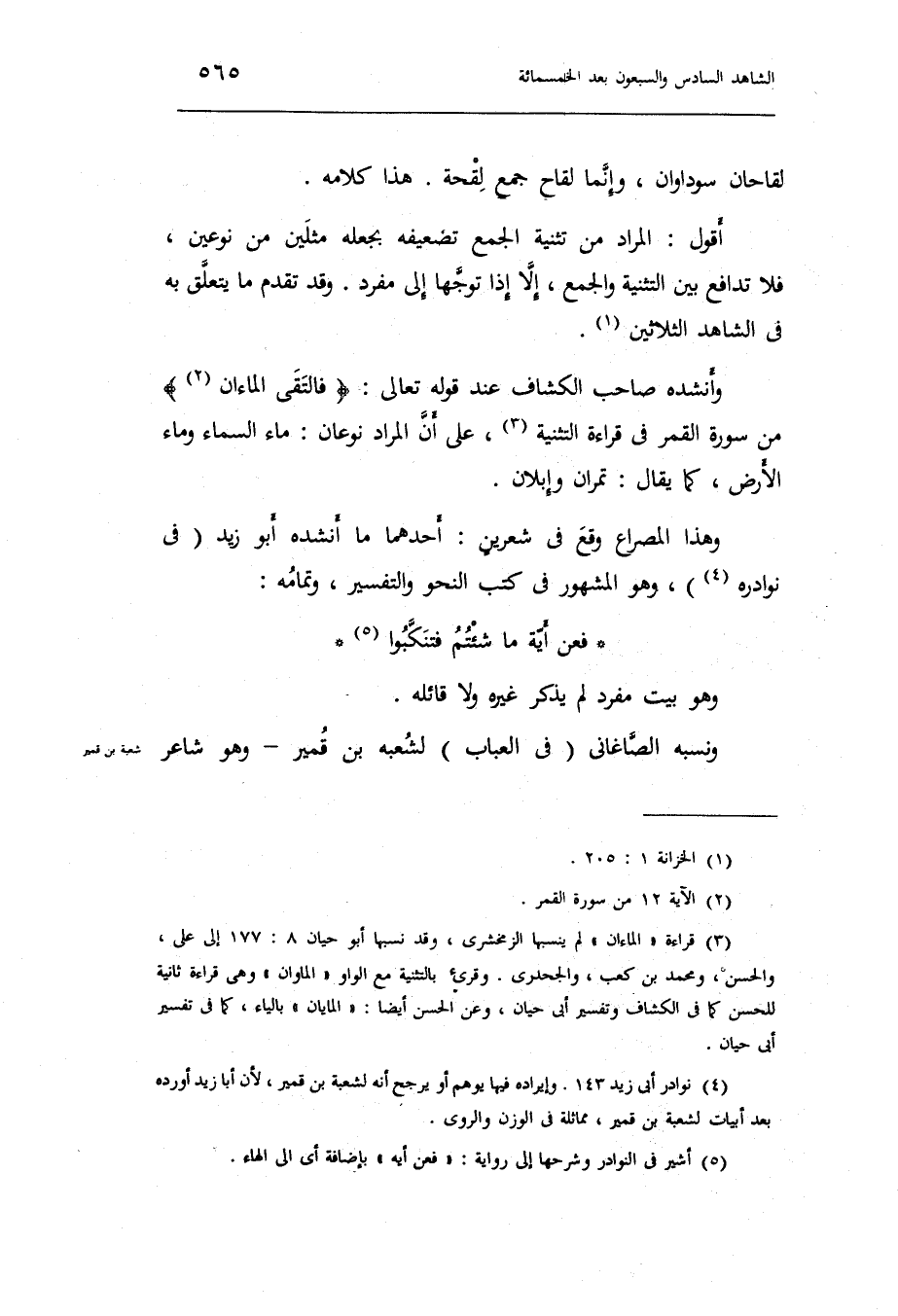 وأنشده صَاحب الْكَشَّاف عِنْد قَوْله تَعَالَى: فَالتقى الماءان من سُورَة الْقَمَر فِي قِرَاءَة التَّثْنِيَة على أَن المُرَاد نَوْعَانِ: مَاء السَّمَاء وَمَاء الأَرْض كَمَا يُقَال: تمران وإبلان.