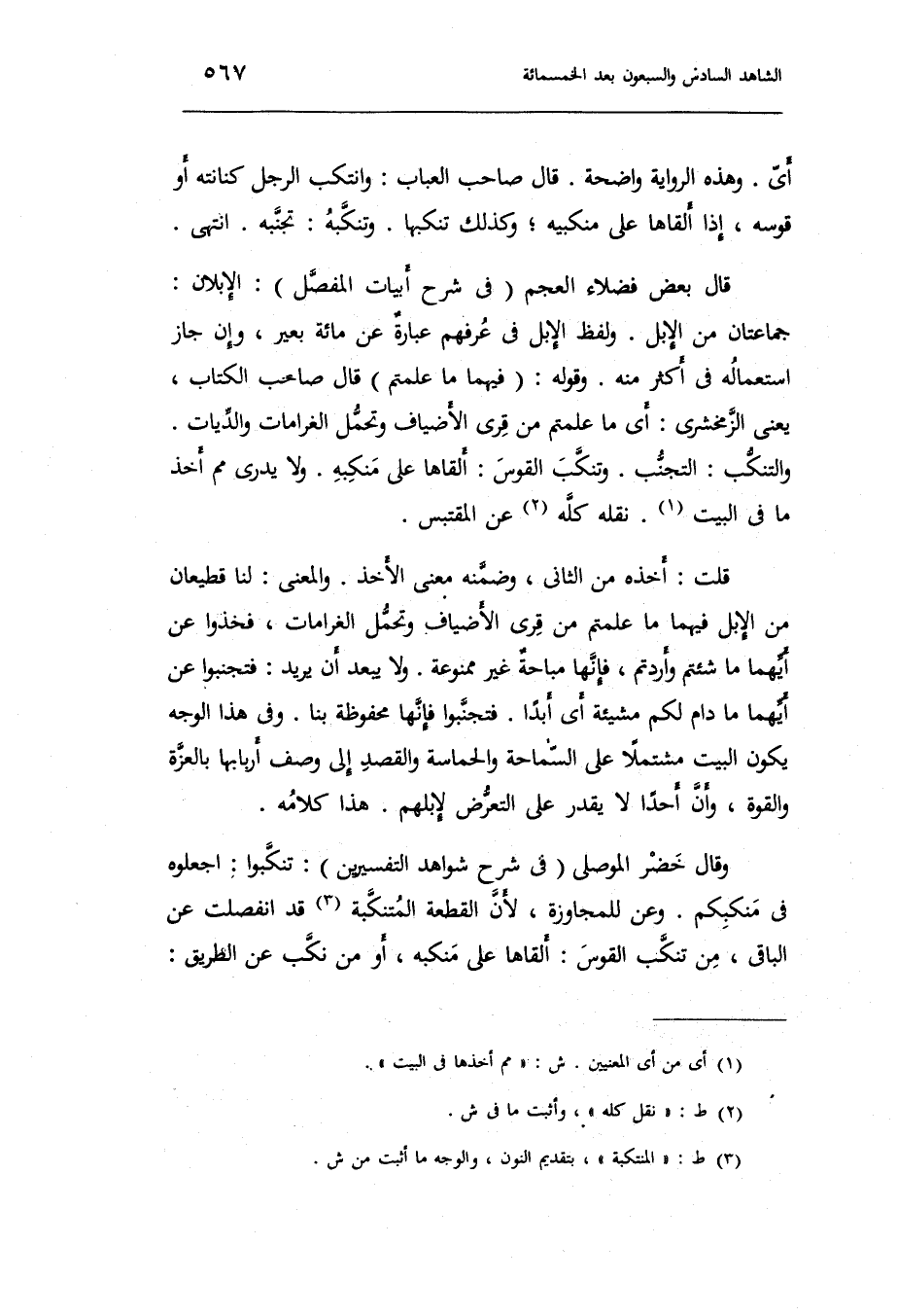 وَقَوله: فيهمَا مَا علمْتُم قَالَ صَاحب الْكتاب يَعْنِي الزَّمَخْشَرِيّ: أَي مَا علمْتُم من قرى الأضياف وَتحمل الغرامات والديات. والتنكب: التجنب. وتنكب الْقوس: أَلْقَاهَا على مَنْكِبه.