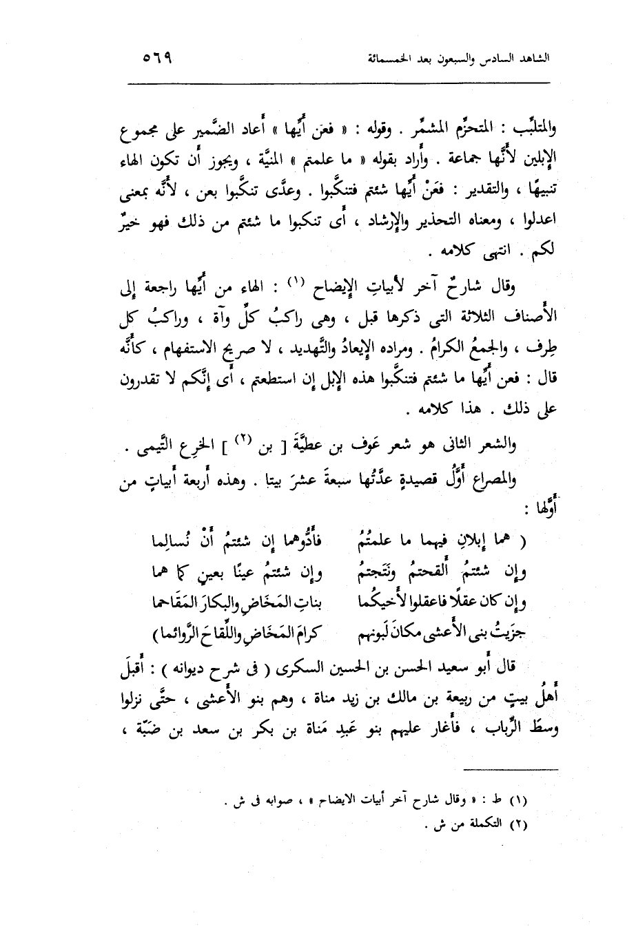 وَقَالَ شارحٌ آخر لأبيات الْإِيضَاح: الْهَاء من أَيهَا رَاجِعَة إِلَى الْأَصْنَاف الثَّلَاثَة الَّتِي ذكرهَا قبل وَهِي رَاكب كل وآة وراكب كل طرف وَالْجمع الْكِرَام. وَمرَاده الإيعاد والتهديد لَا صَرِيح الِاسْتِفْهَام كَأَنَّهُ قَالَ: فَعَن أَيهَا مَا شِئْتُم فتنكبوا هَذِه الْإِبِل إِن اسْتَطَعْتُم أَي: إِنَّكُم لَا تقدرون على ذَلِك. هَذَا كَلَامه.