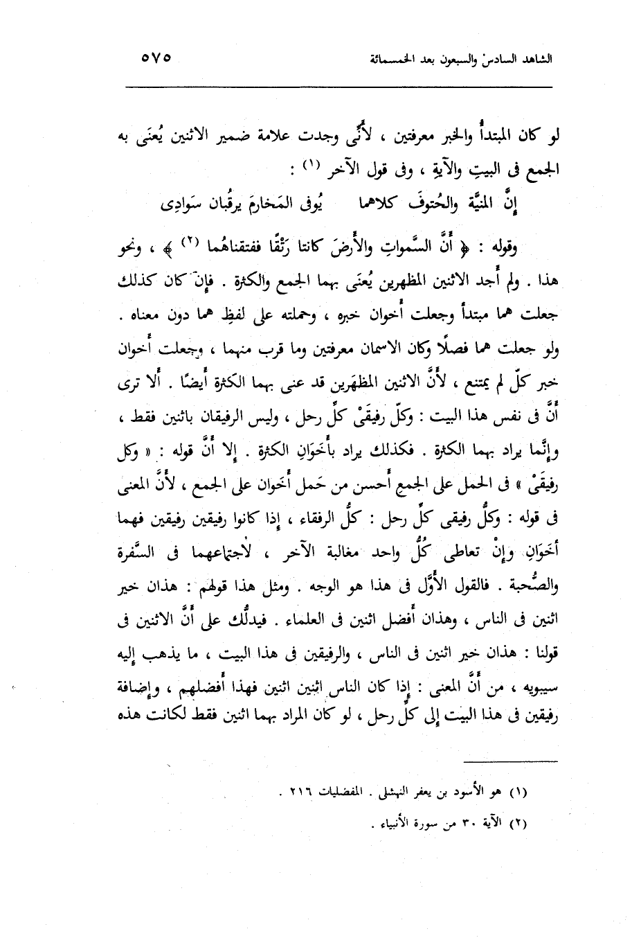 إِلَّا أَن قَوْله: وكل رفيقي فِي الْحمل على الْجمع أحسن من حمل أَخَوان على الْجمع لِأَن الْمَعْنى فِي قَوْله: وكل رفيقي كل رَحل كل الرفقاء إِذا كَانُوا رَفِيقَيْنِ رَفِيقَيْنِ فهما أَخَوان وَإِن تعاطى كل وَاحِد مغالبة الآخر لاجتماعهما فِي السفرة والصحبة.