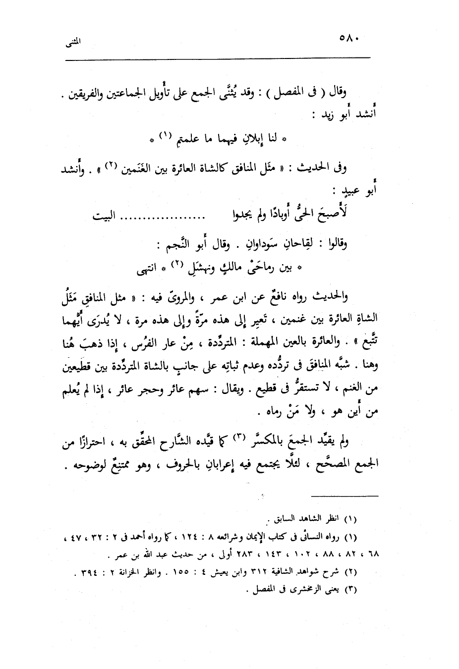 وَقَالَ فِي الْمفصل: وَقد يثنى الْجمع على تَأْوِيل الجماعتين والفريقين. أنْشد أَبُو زيد: لنا إبلان فيهمَا مَا علمْتُم وَفِي الحَدِيث: مثل الْمُنَافِق كالشاة العائرة بَين الْغَنَمَيْنِ.