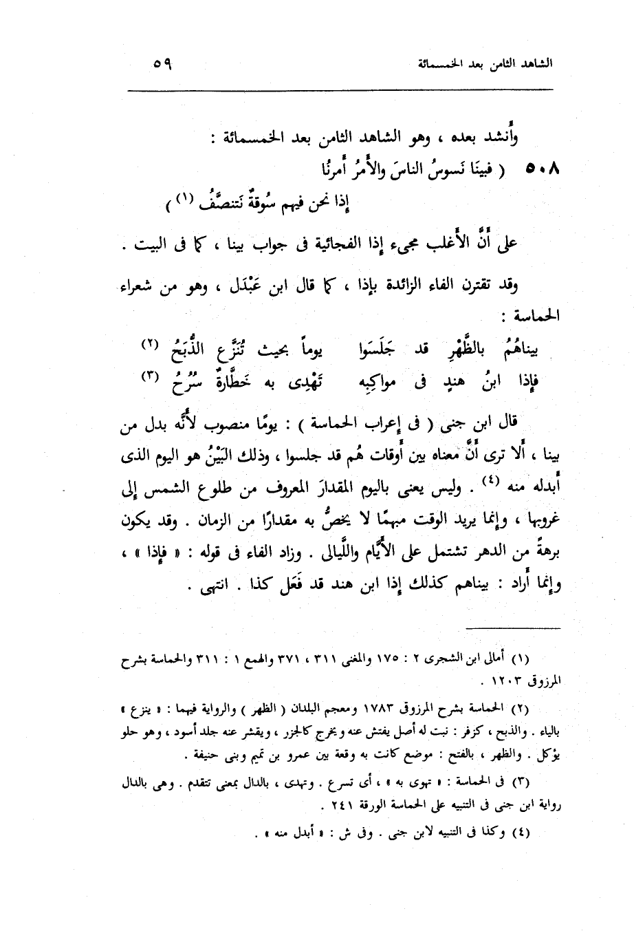 قَالَ ابْن جني فِي إِعْرَاب الحماسة: يَوْمًا مَنْصُوب لِأَنَّهُ بدل من بَينا أَلا ترى أَن مَعْنَاهُ بَين أَوْقَات هم قد جَلَسُوا وَذَلِكَ الْبَين هُوَ الْيَوْم الَّذِي أبدله مِنْهُ. وَلَيْسَ يَعْنِي بِالْيَوْمِ الْمِقْدَار الْمَعْرُوف من طُلُوع الشَّمْس إِلَى غُرُوبهَا وَإِنَّمَا يُرِيد الْوَقْت مُبْهما لَا يخص بِهِ مِقْدَارًا من الزَّمَان. وَقد يكون بُرْهَة من الدَّهْر تشْتَمل على الْأَيَّام والليالي. وَزَاد الْفَاء فِي قَوْله: فَإِذا وَإِنَّمَا أَرَادَ: بيناهم كَذَلِك إِذا ابْن هِنْد قد فعل كَذَا. انْتهى.