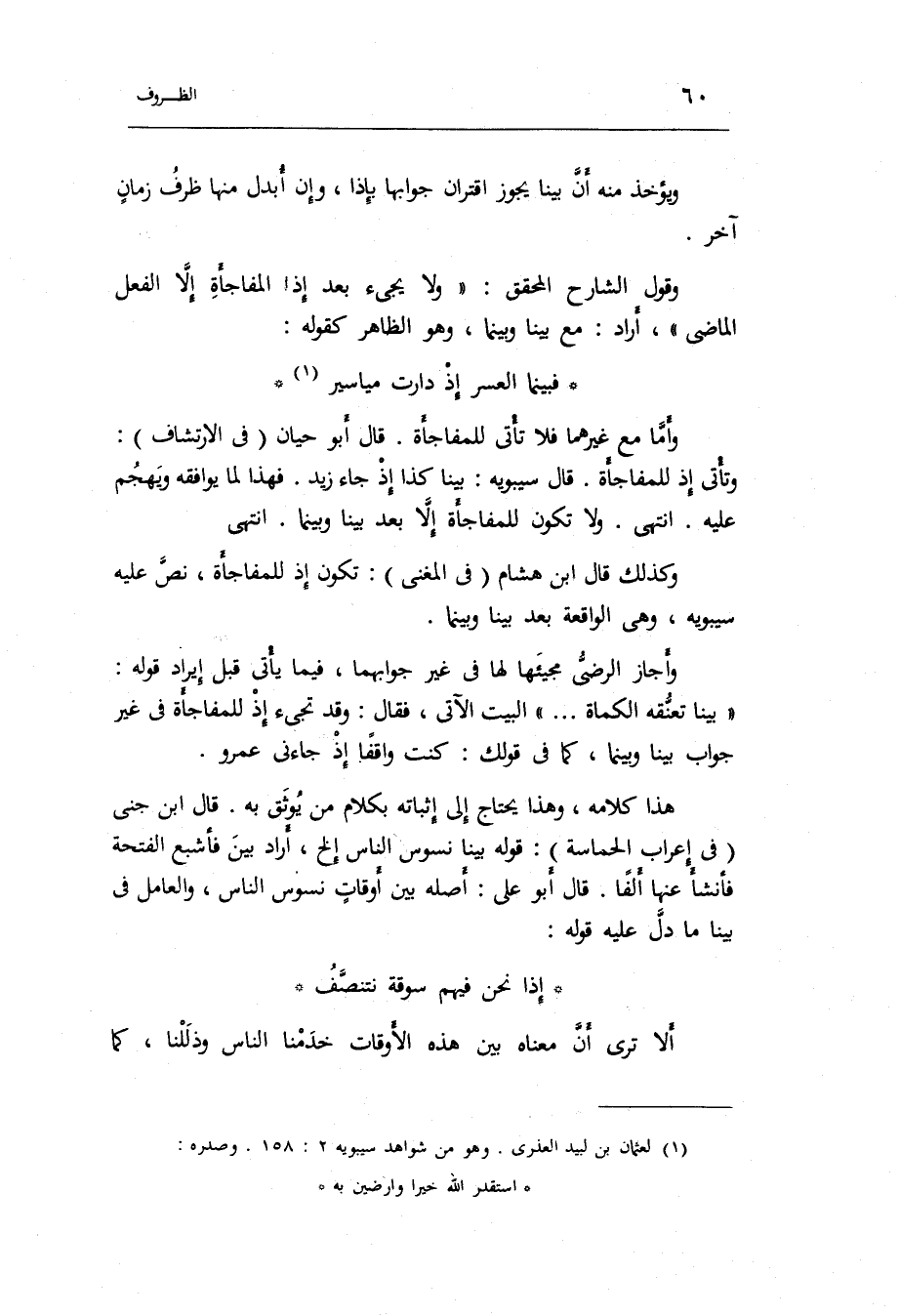 وَهَذَا يحْتَاج إِلَى إثْبَاته بِكَلَام من يوثق بِهِ. قَالَ ابْن جني فِي إِعْرَاب الحماسة: قَوْله: بَينا نسوس النَّاس إِلَخ أَرَادَ بَين فأشبع الفتحة فَأَنْشَأَ عَنْهَا ألفا. قَالَ أَبُو عَليّ: أَصله بَين أوقاتٍ نسوس النَّاس)