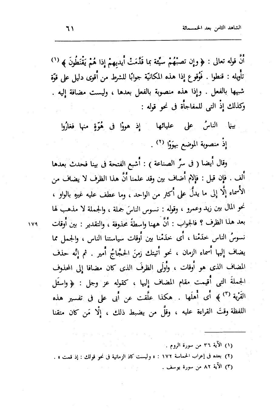 ثمَّ إِنَّه حذف الْمُضَاف الَّذِي هُوَ أَوْقَات وَأولى الظّرْف الَّذِي كَانَ مُضَافا إِلَى الْمَحْذُوف الْجُمْلَة الَّتِي أُقِيمَت مقَام الْمُضَاف إِلَيْهَا كَقَوْلِه عَزَّ وَجَلَّ: واسئل الْقرْيَة أَي: أَهلهَا. هَكَذَا علقت عَن أبي عَليّ فِي تَفْسِير هَذِه اللَّفْظَة وَقت الْقِرَاءَة عَلَيْهِ وَقل من يضْبط ذَلِك إِلَّا من كَانَ متقناً