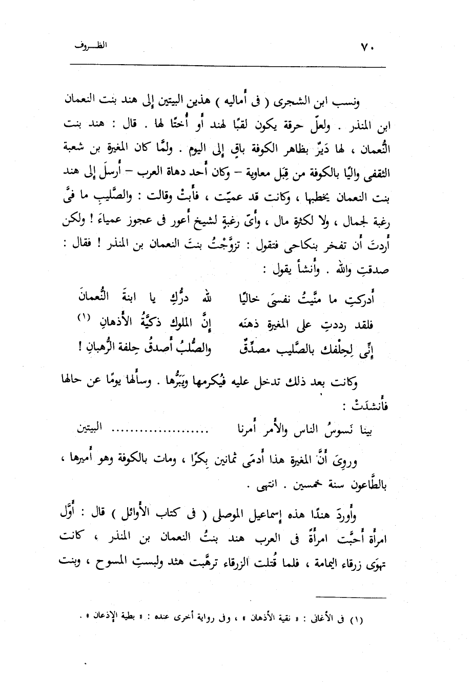 وَنسب ابْن الشجري فِي أَمَالِيهِ هذَيْن الْبَيْتَيْنِ إِلَى هِنْد بنت النُّعْمَان بن الْمُنْذر.