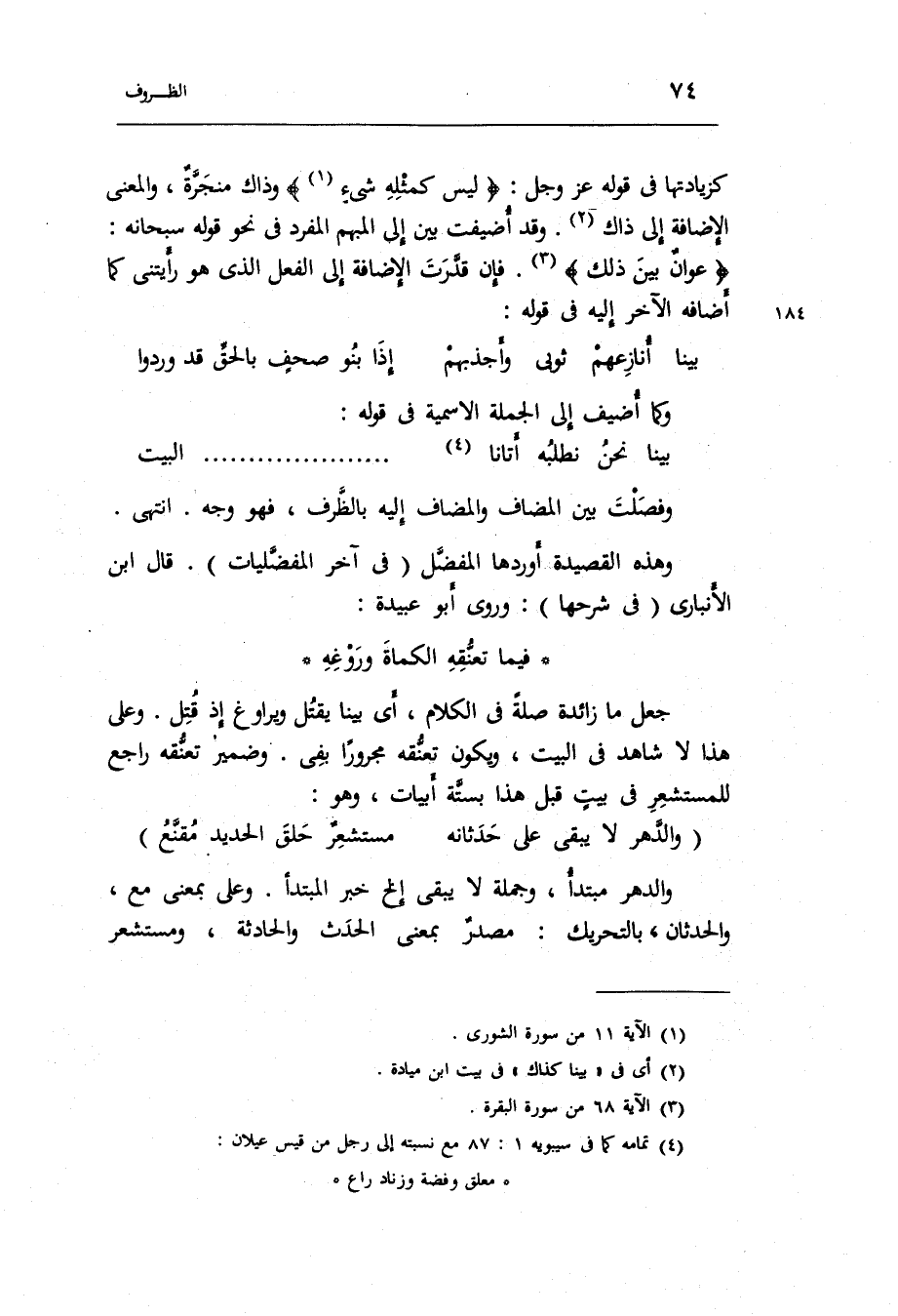 كزيادتها فِي قَوْله عَزَّ وَجَلَّ: لَيْسَ كمثله شَيْء وَذَاكَ منجرةٌ وَالْمعْنَى الْإِضَافَة إِلَى ذَاك. وَقد أضيفت بَين إِلَى الْمُبْهم الْمُفْرد فِي نَحْو قَوْله سُبْحَانَهُ: عوانٌ بَين ذَلِك.
