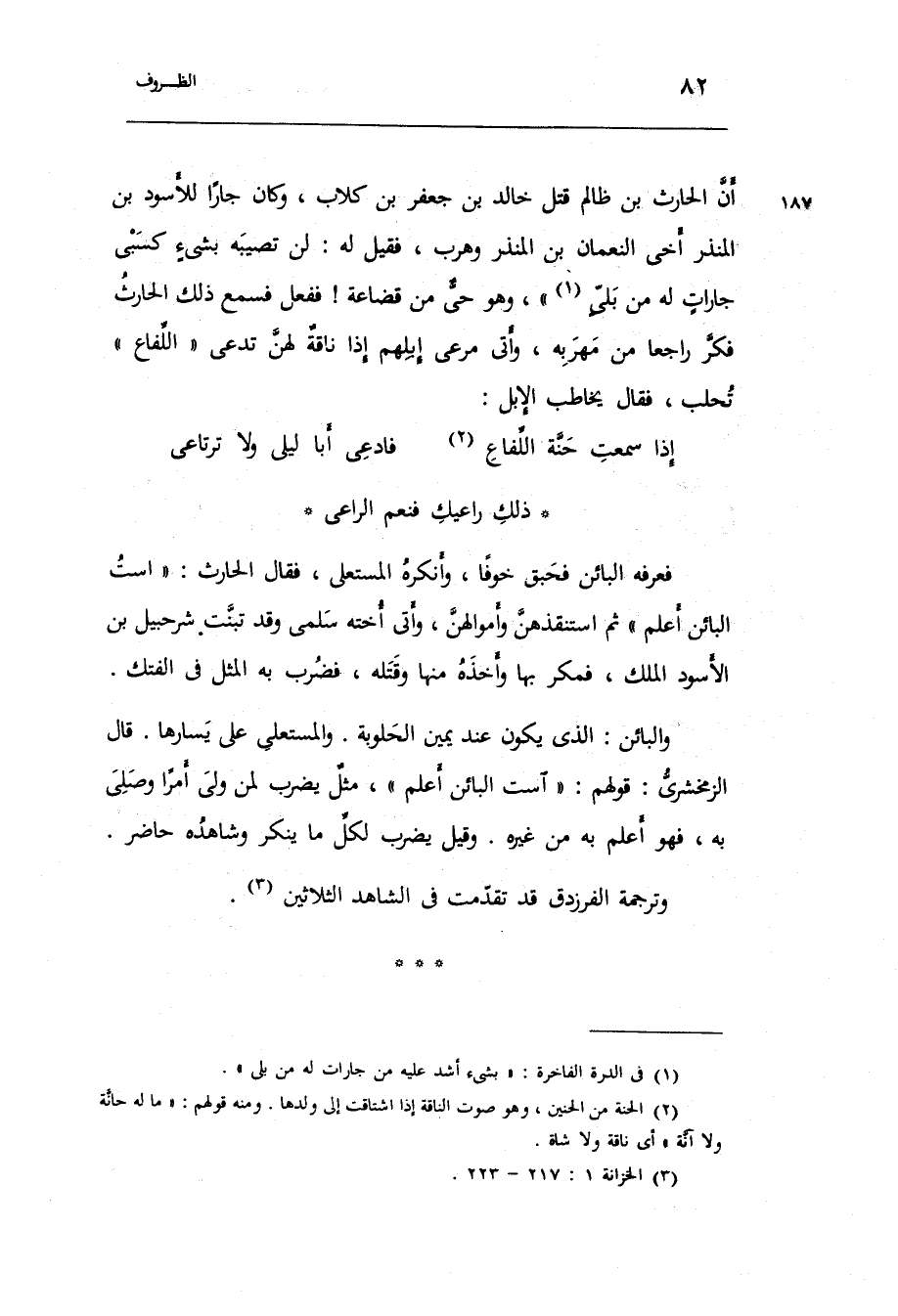 أَن الْحَارِث بن ظَالِم قتل خَالِد بن جَعْفَر بن كلاب وَكَانَ جاراً للأسود بن الْمُنْذر أخي النُّعْمَان بن الْمُنْذر وهرب فَقيل لَهُ: لن تصيبه بشيءٍ كسبي جاراتٍ لَهُ من بلي وَهُوَ حَيّ من قضاعة فَفعل فَسمع ذَلِك الْحَارِث فكر رَاجعا من مهربه وأتى مرعى إبلهم إِذا ناقةٌ لَهُنَّ تدعى اللفاع تحلب فَقَالَ يُخَاطب الْإِبِل: الرجز