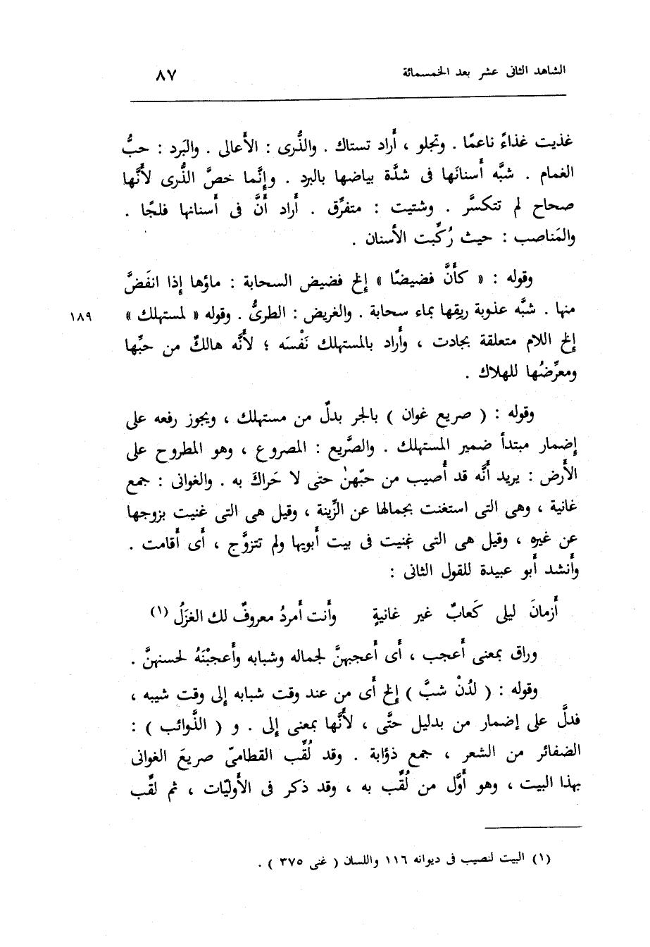 شبه أسنانها فِي شدَّة بياضها بالبرد. وَإِنَّمَا خص الذرى لِأَنَّهَا صِحَاح لم تتكسر. وشتيت: وَقَوله: كَأَن فضيضاً إِلَخ فضيض السحابة: مَاؤُهَا إِذا انفض مِنْهَا. شبه عذوبة رِيقهَا بِمَاء سَحَابَة. والغريض: الطري. وَقَوله: لمستهلك إِلَخ اللَّام مُتَعَلقَة بجادت وَأَرَادَ بالمستهلك نَفسه لِأَنَّهُ هالكٌ من حبها ومعرضها للهلاك.