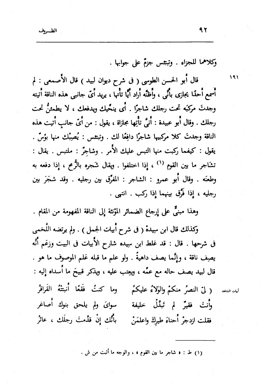 قَالَ أَبُو الْحسن الطوسي فِي شرح ديوَان لبيد قَالَ الْأَصْمَعِي: لم أسمع أحدا يجازى بأنى وَأَظنهُ أَرَادَ أياً تأتها يُرِيد أَي جَانِبي هَذِه النَّاقة أَتَيْته وجدت مركبه تَحت رجلك شاجراً أَي: ينحيك ويدفعك لَا يطمئن تَحت رجلك.