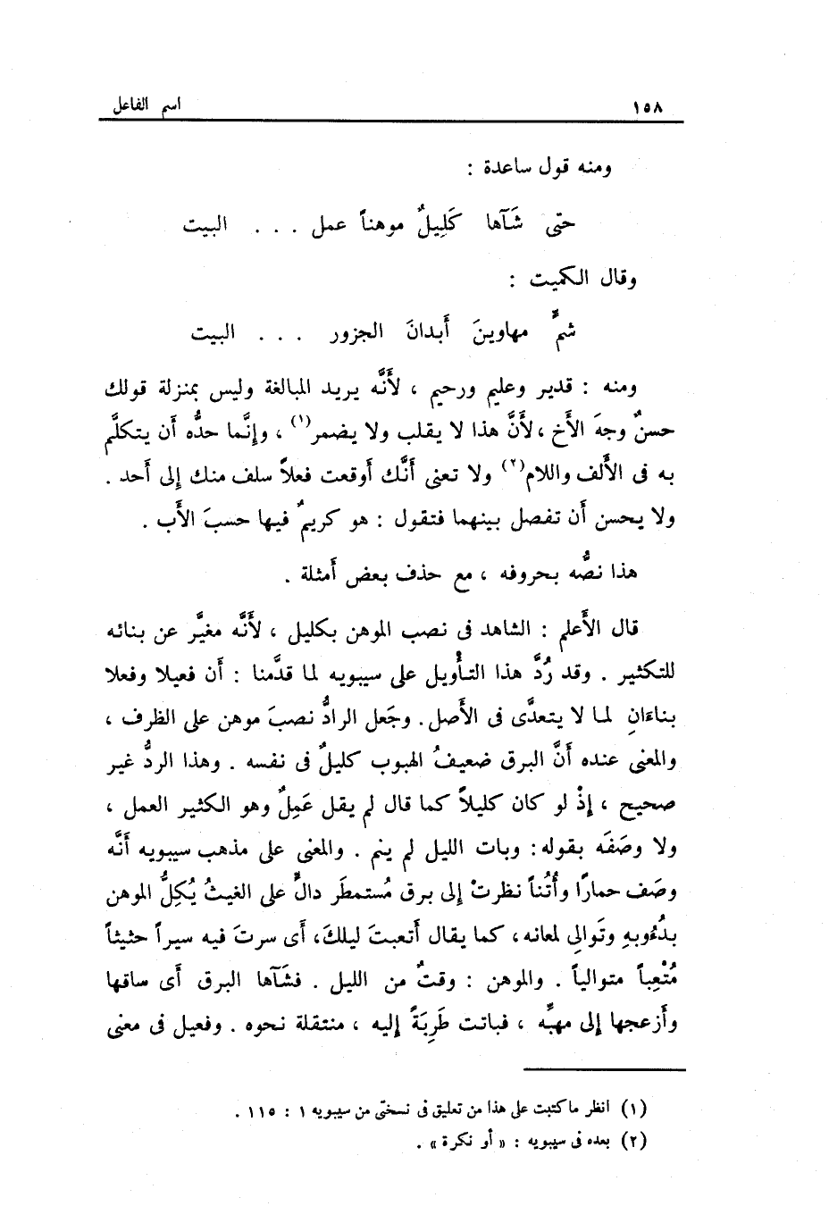 حَتَّى شأها كليلٌ موهناً عمل ... ... ... الْبَيْت وَقَالَ الْكُمَيْت: وَمِنْه: قدير وَعَلِيم وَرَحِيم لِأَنَّهُ يُرِيد الْمُبَالغَة وَلَيْسَ بِمَنْزِلَة قَوْلك حسنٌ وَجه الْأَخ لِأَن هَذَا لَا)