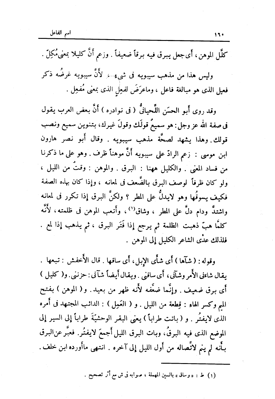 وَقَالَ أَبُو نصر هَارُون بن مُوسَى: زعم الرادّ على سِيبَوَيْهٍ أَن موهناً ظرف. وَهُوَ على مَا ذكرنَا من فَسَاد الْمَعْنى. والكليل هَا هُنَا: الْبَرْق والموهن: وَقت من اللَّيْل وَلَو كَانَ ظرفا لوصف الْبَرْق بالضعف فِي لمعانه وَإِذا كَانَ بِهَذِهِ الصّفة فَكيف يَسُوقهَا وَهُوَ لَا يدل على الْمَطَر وَلَكِن الْبَرْق إِذا تكَرر فِي لمعانه وَاشْتَدَّ ودام دلّ على الْمَطَر وشاق وأتعب الموهن فِي ظلمته لِأَنَّهُ كلما هَب ذهبت الظلمَة ثمَّ يرجع إِذا فتر الْبَرْق ثمَّ يذهب إِذا لمع. فَلذَلِك عدى الشَّاعِر الكليل إِلَى الموهن.