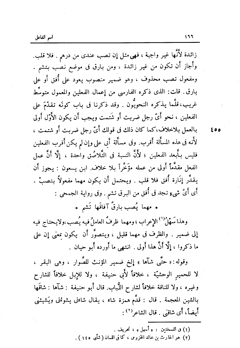 وَأَجَازَ أَن تكون من غير زَائِدَة وَمن بارق فِي مَوضِع نصب بتشم ومفعول تصب مَحْذُوف وَهُوَ ضمير مَنْصُوب يعود على أفق أَو على بارق. قلت: الَّذِي ذكره الْفَارِسِي من إِعْمَال الْفِعْلَيْنِ والمعمول متوسط غَرِيب قَلما يذكرهُ النحويون.