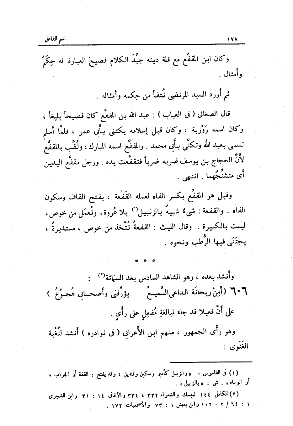 قَالَ الصغاني فِي الْعباب: عبد الله بن المقفع كَانَ فصيحاً بليغاً وَكَانَ اسْمه روزبة وَكَانَ قبل إِسْلَامه يكتنى بأبى عمر فَلَمَّا أسلم تسمى بِعَبْد الله وتكنى بأبى مُحَمَّد. والمقفع اسْمه الْمُبَارك ولقب بالمقفع لِأَن الْحجَّاج بن يُوسُف ضربه ضربا فتقفعت يَده. وَرجل مقفع الْيَدَيْنِ. أَي: وَقيل هُوَ المقفع بِكَسْر الْفَاء لعمله القفعة بِفَتْح الْقَاف وَسُكُون الْفَاء. والقفعة: شيءٌ شَبيه بالزنبيل بِلَا عُرْوَة وتعمل من خوص لَيست بالكبيرة. وَقَالَ اللَّيْث: القفعة تتَّخذ من خوص مستديرةٌ يجتنى فِيهَا الرطب وَنَحْوه.