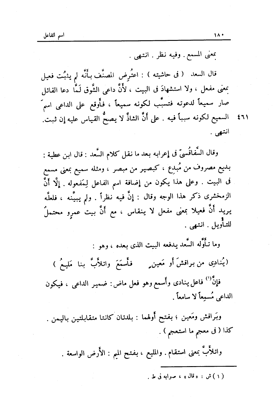 قَالَ السعد فِي حَاشِيَته: اعْترض المُصَنّف بِأَنَّهُ لم يثبت فعيل بِمَعْنى مفعل وَلَا استشهاد فِي الْبَيْت لِأَن دَاعِي الشوق لما دَعَا الْقَائِل صَار سميعاً لدعوته فتسبب لكَونه سميعاً فأوقع على الدَّاعِي اسْم السَّمِيع لكَونه سَببا فِيهِ. على أَن الشاذ لَا يَصح الْقيَاس عَلَيْهِ إِن ثَبت. انْتهى.