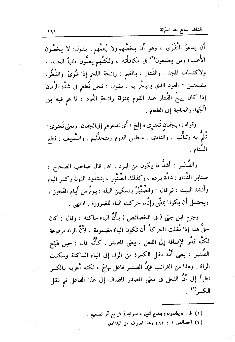 وَجزم ابْن جني فِي الخصائص بِأَن الْبَاء سَاكِنة وَقَالَ: كَانَ حق هَذَا إِذا نقلت الْحَرَكَة أَن تكون الْبَاء مَضْمُومَة لِأَن الرَّاء مَرْفُوعَة لكنه قدر الْإِضَافَة إِلَى الْفِعْل يَعْنِي الْمصدر. كَأَنَّهُ قَالَ: حِين هيج الصنبر يَعْنِي أَنه نقل الكسرة من الرَّاء إِلَى الْبَاء الساكنة وسكنت الرَّاء.