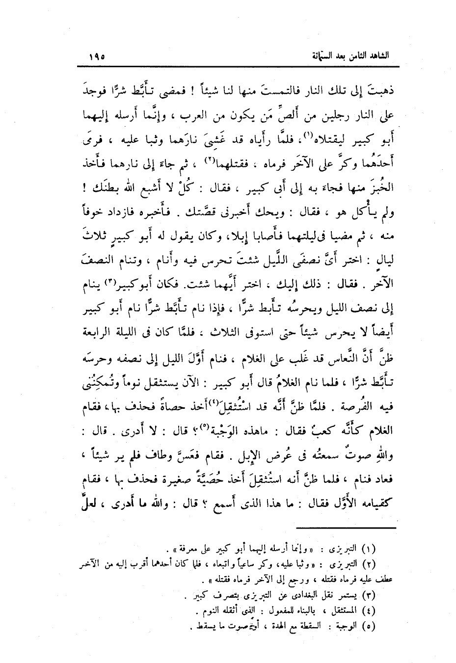 من الْعَرَب وَإِنَّمَا أرْسلهُ إِلَيْهِمَا أَبُو كَبِير ليقتلاه فَلَمَّا رأياه قد غشي نارهما وثبا عَلَيْهِ فَرمى أَحدهمَا وكر على الآخر فَرَمَاهُ فَقَتَلَهُمَا ثمَّ جَاءَ إِلَى نارهما فَأخذ الْخبز مِنْهَا فجَاء بِهِ إِلَيّ أبي كَبِير فَقَالَ: كل لَا أشْبع الله بَطْنك وَلم يَأْكُل هُوَ فَقَالَ: وَيحك أَخْبرنِي قصتك. قَالَ وَمَا سؤالك عَن هَذَا كل ودع الْمَسْأَلَة.